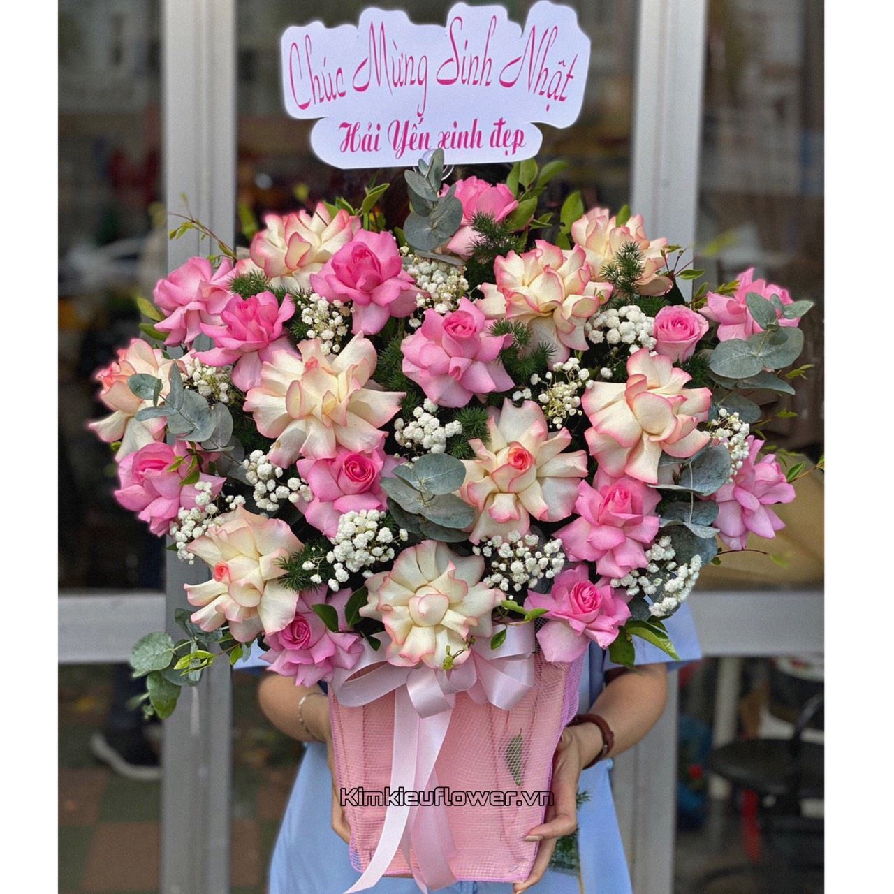 Mẫu HG563 gồm các loại hoa: + 13 hoa hồng dâu lận cánh + 9 hoa hồng hỷ trứng lận + và các lá phụ khác - Liên hệ KIM KIỀU FLOWER để tư vấn thiết kế mẫu hoa theo yêu cầu bạn nhé!