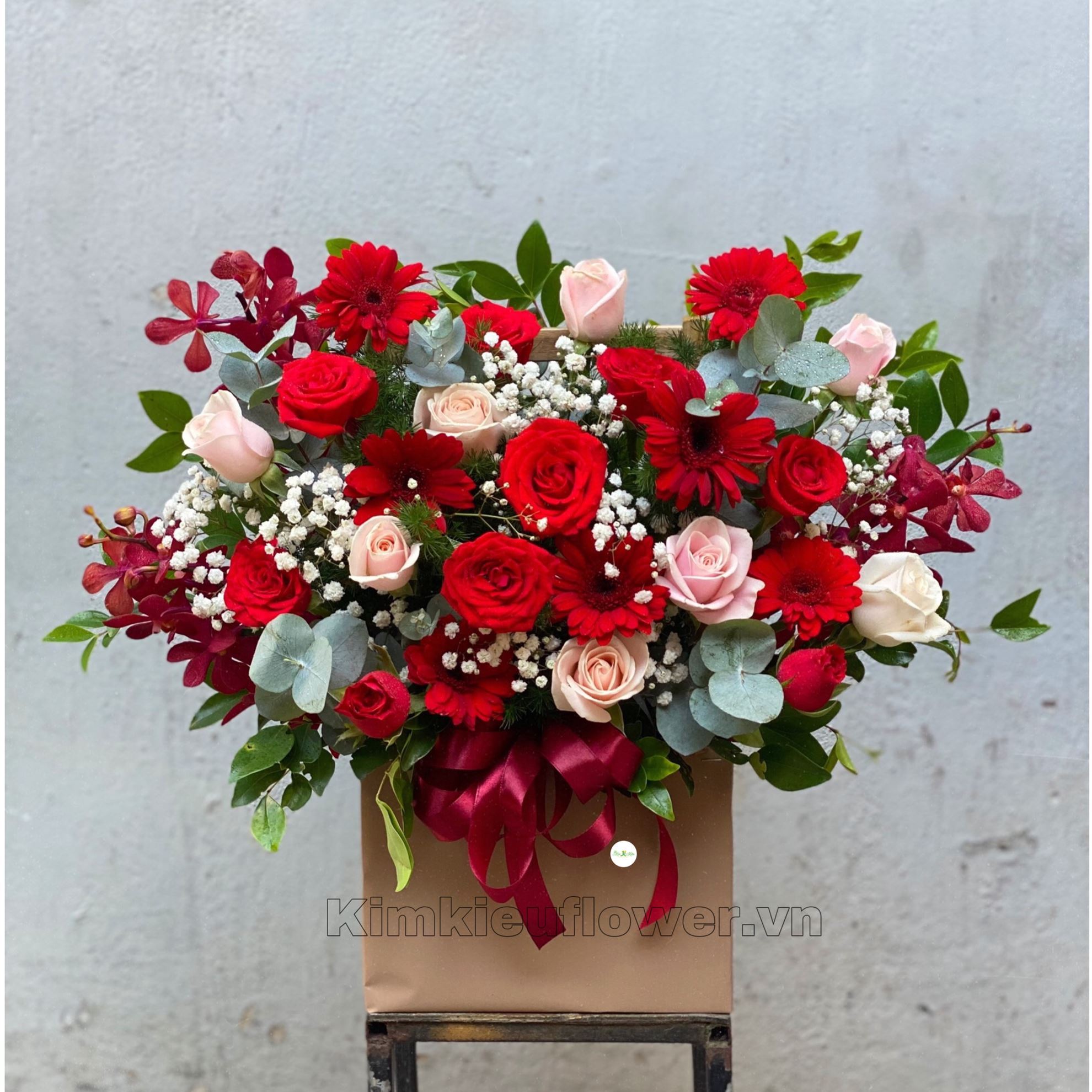 Mẫu HG282 gồm các loại hoa: + 9 hoa hồng đỏ pháp + 8 hoa hồng kem + 3 lan đỏ + 7 đồng tiền đỏ + và các hoa,lá phụ khác - Liên hệ KIM KIỀU FLOWER để tư vấn thiết kế mẫu hoa theo yêu cầu bạn nhé!