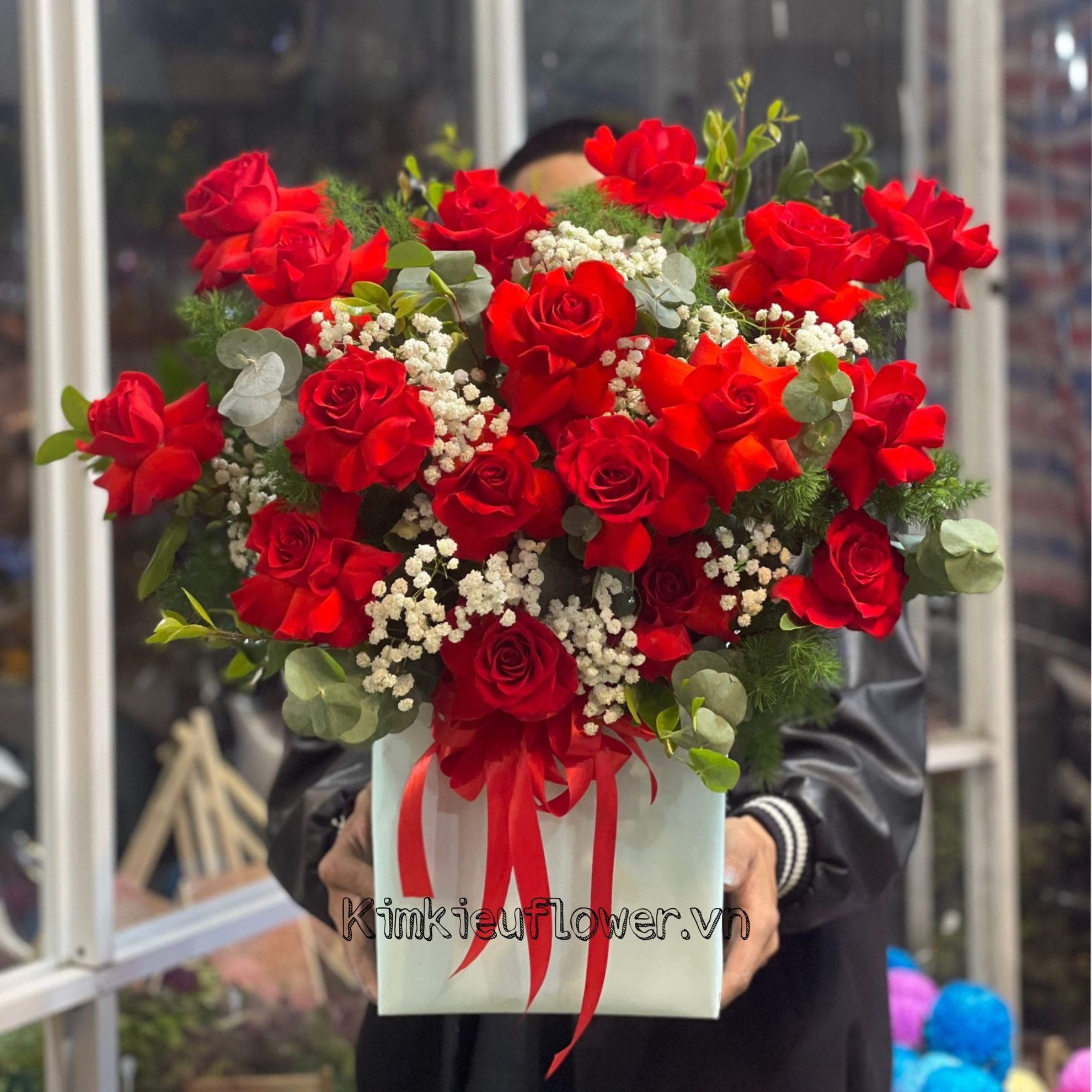 Mẫu HG404 gồm các loại hoa: + 17 hoa hồng đỏ lận cánh + và các lá phụ khác - Liên hệ KIM KIỀU FLOWER để tư vấn thiết kế mẫu hoa theo yêu cầu bạn nhé!