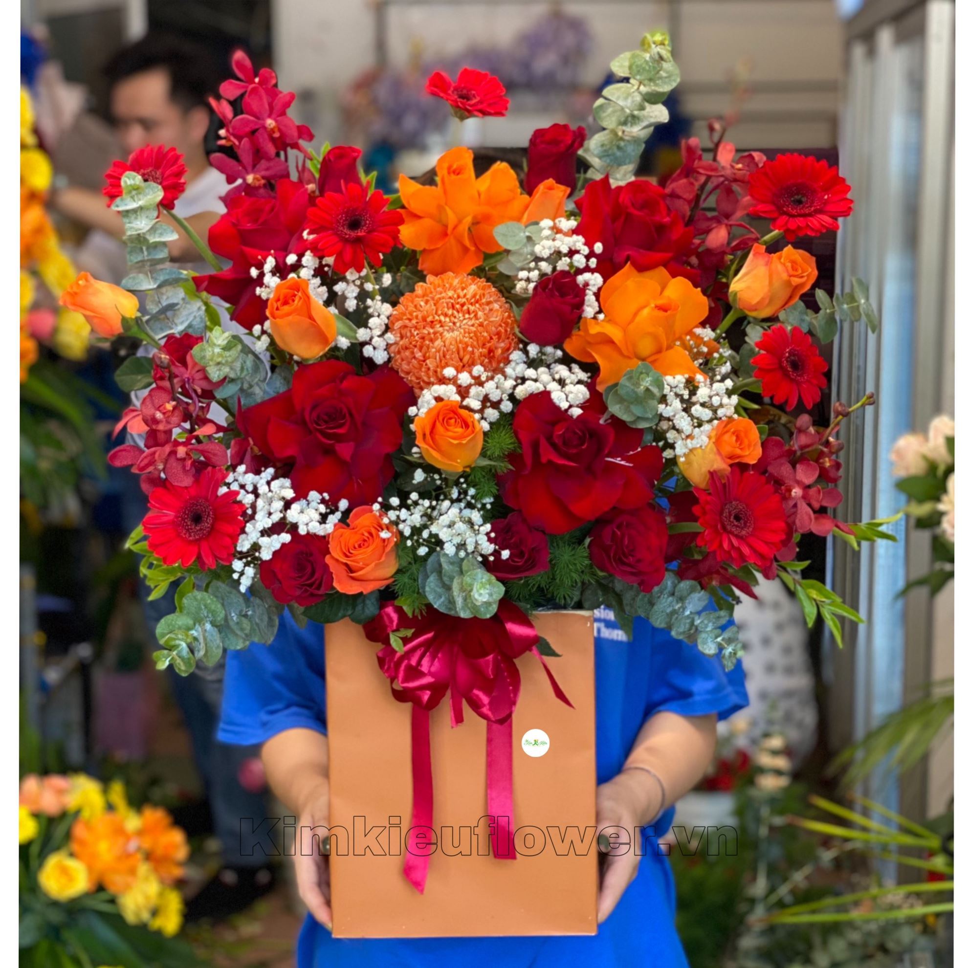Mẫu HG338 gồm các loại hoa: + 11 hoa hồng đỏ (4 lận - 7 không lận) + 9 hoa hồng cam quốc vương (2 lận - 7 không lận) + 1 cúc mẫu đơn cam + 4 lan đỏ + 7 đồng tiền nhí đỏ + và các lá phụ khác - Liên hệ KIM KIỀU FLOWER để tư vấn thiết kế mẫu hoa theo yêu cầu bạn nhé!