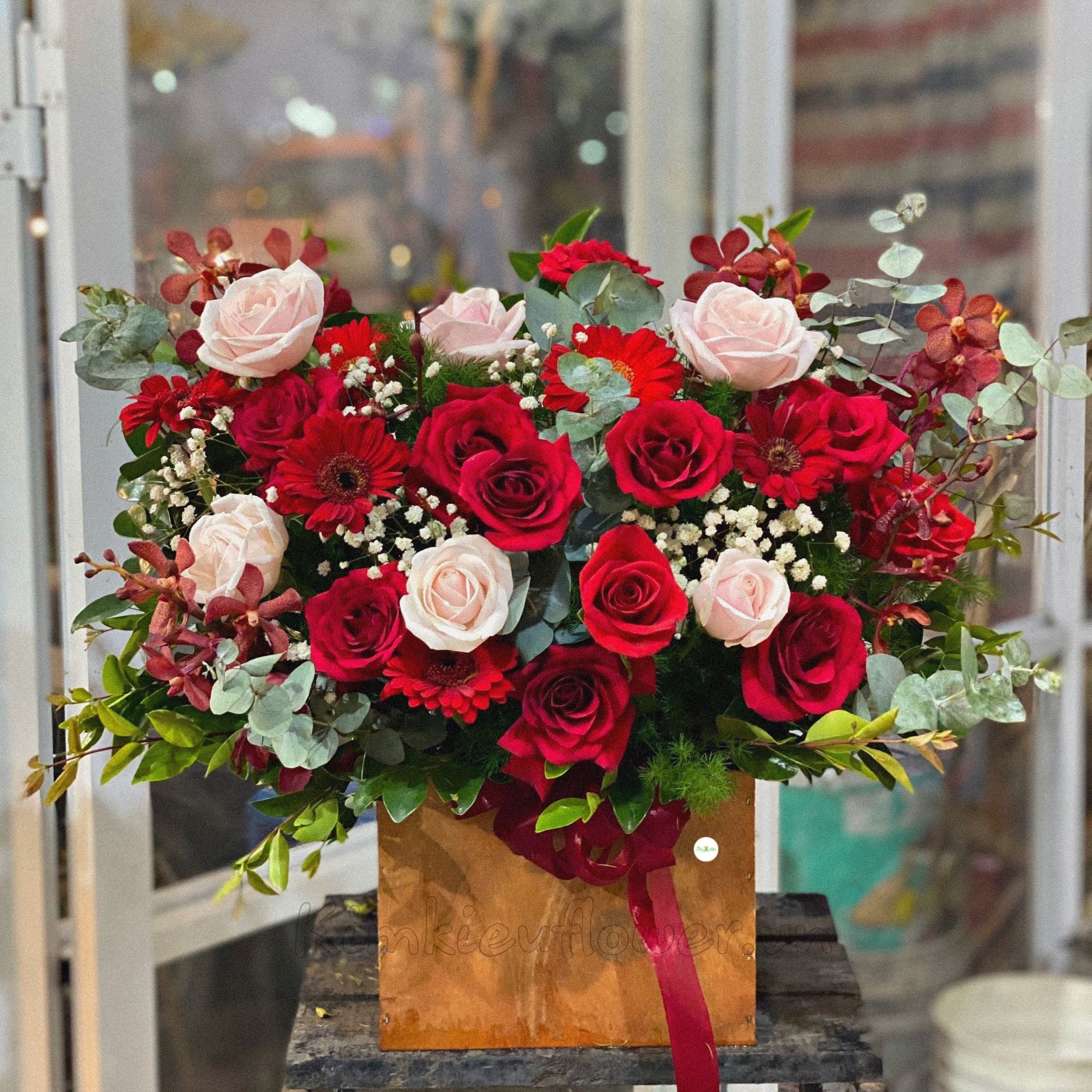 Mẫu HG280 gồm các loại hoa : + hoa hồng đỏ + hoa hồng kem + lan đỏ + đồng tiền đỏ + và các hoa,lá phụ khác - Liên hệ KIM KIỀU FLOWER để tư vấn thiết kế mẫu hoa theo yêu cầu bạn nhé!