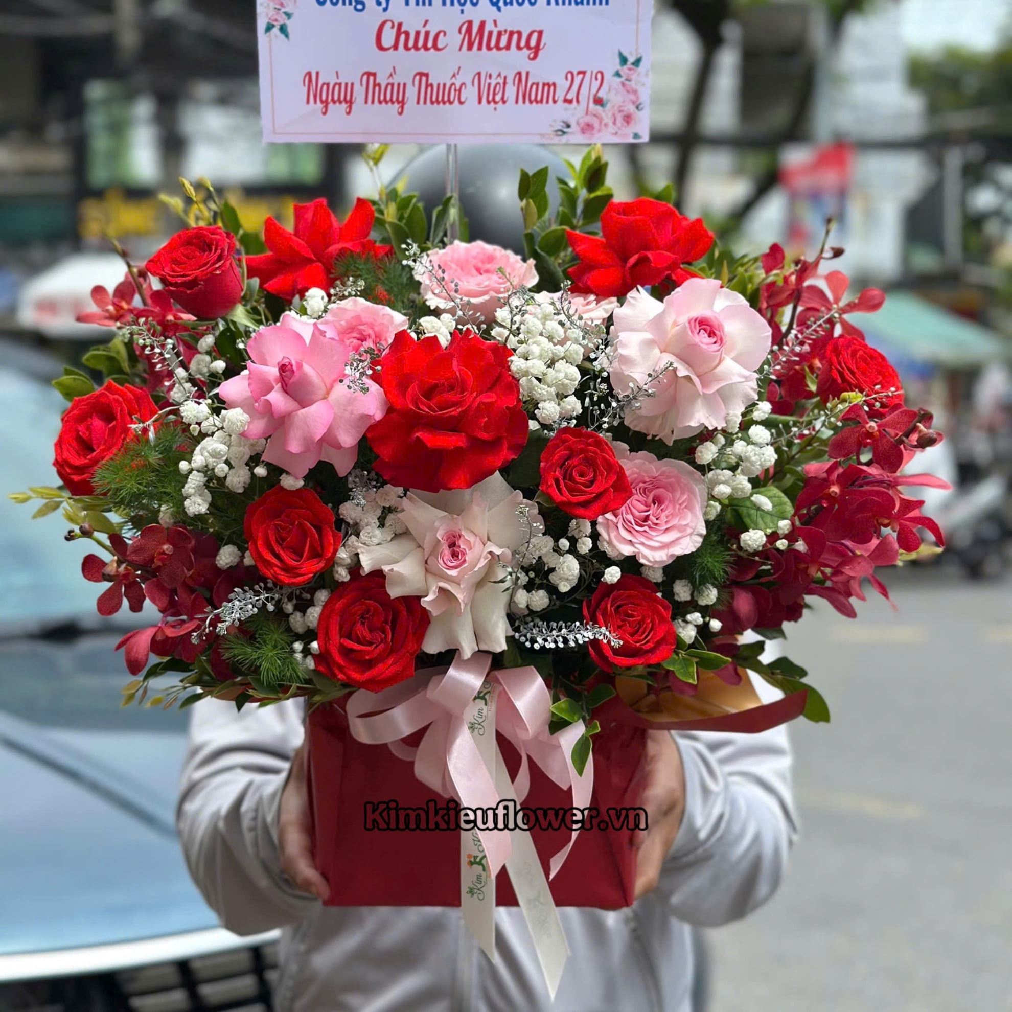 Mẫu HG821 gồm các loại hoa : + 4 lan đỏ + 10 hồng đỏ ( 3 lận, 7 không lận ) + 6 hồng lạc thần ( 4 lận, 2 không lận ) + 1 hồng dâu lận cánh + và các lá phụ khác - Liên hệ KIM KIỀU FLOWER để tư vấn thiết kế mẫu hoa theo yêu cầu bạn nhé!