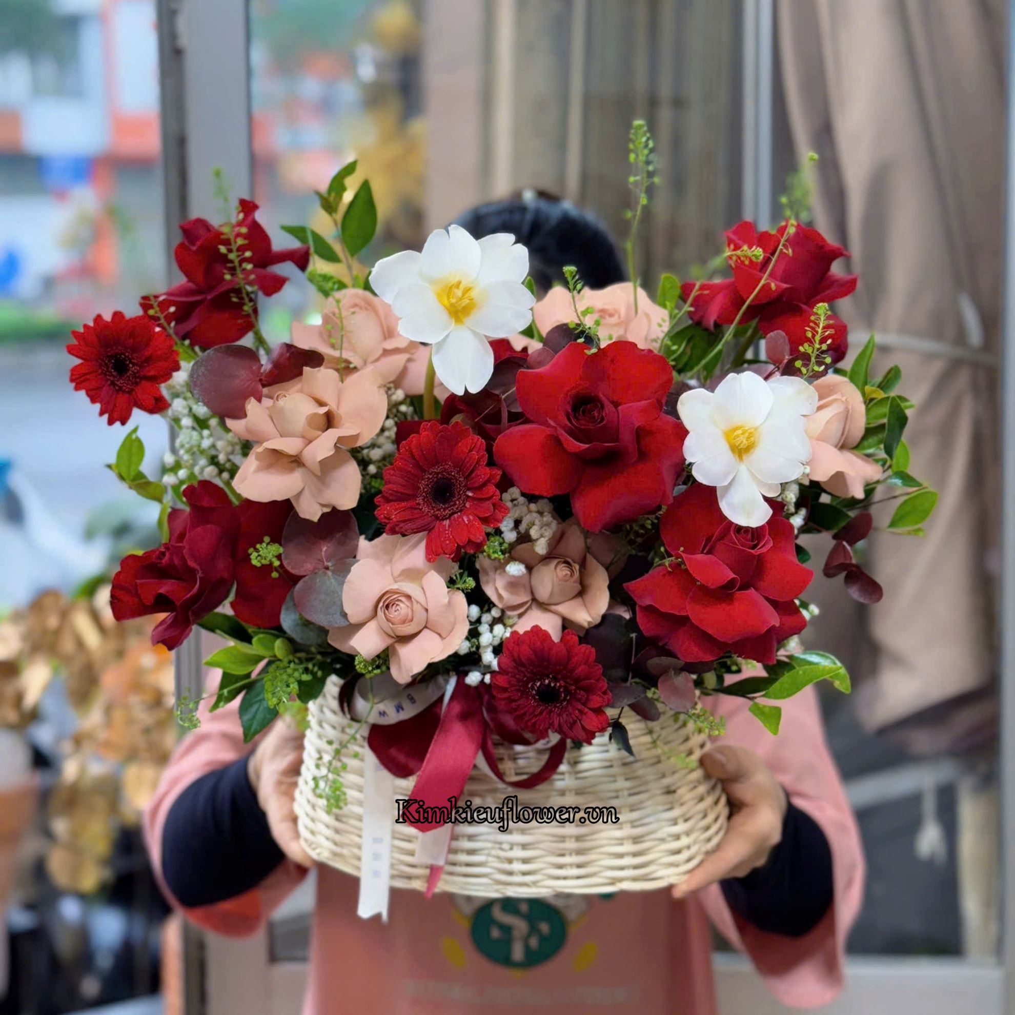 Mẫu HG776 gồm các loại hoa: + 2 Tulip trắng + 6 Hoa hồng đỏ lận cánh + 6 Hoa hồng capu lận cánh + 3 Đồng tiền nhí đỏ + và các lá phụ khác - Liên hệ KIM KIỀU FLOWER để tư vấn thiết kế mẫu hoa theo yêu cầu bạn nhé!