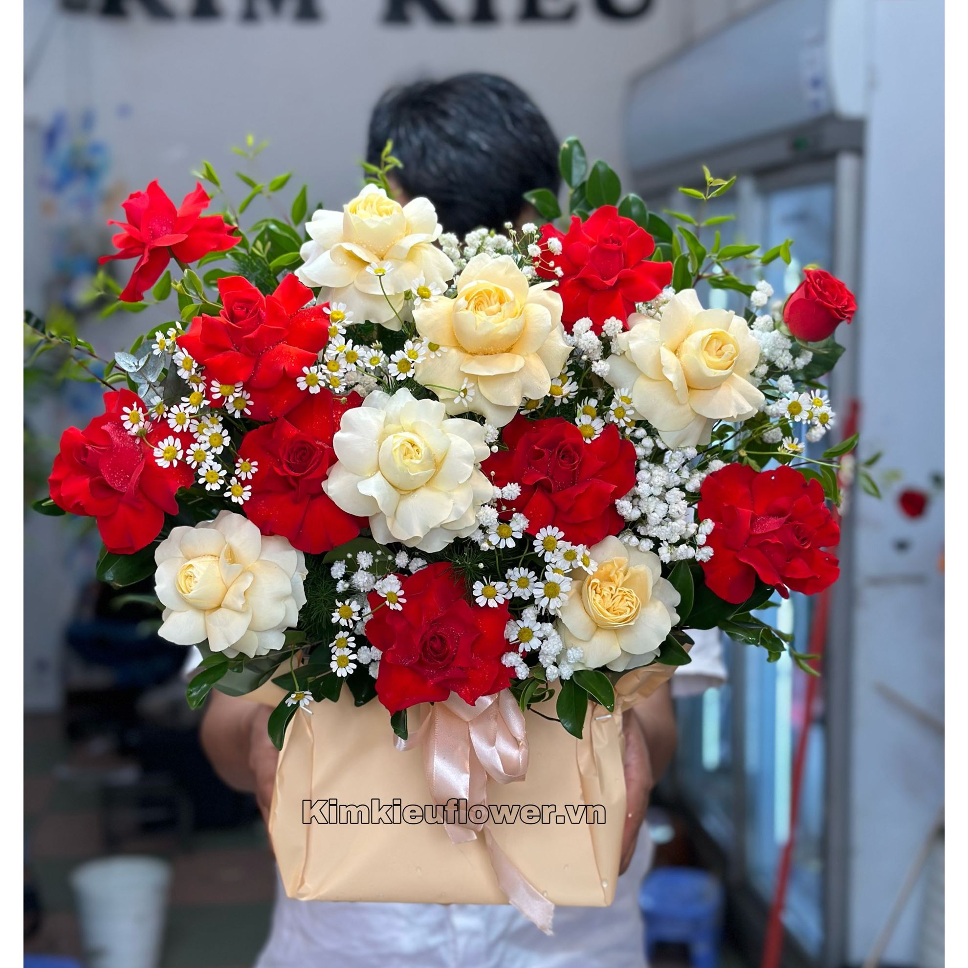 Mẫu HG607 gồm các loại hoa: + 6 hoa hồng victor vàng lận cánh + 9 hoa hồng đỏ pháp (8 lận - 1 không lận) + cúc tana + và các hoa,lá phụ khác - Liên hệ KIM KIỀU FLOWER để tư vấn thiết kế mẫu hoa theo yêu cầu bạn nhé!