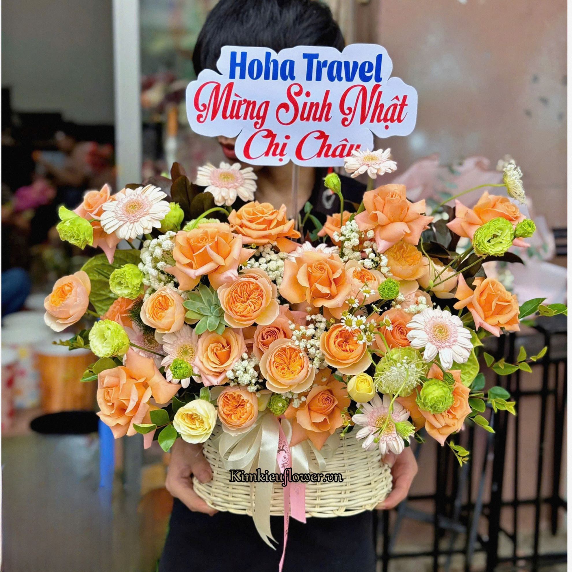 Mẫu HG765 gồm các loại hoa: + 15 Hồng shimmer lận cánh + 10 Hồng juliet + 2 victo vàng + 8 Đồng tiền kem + Cát tường xanh + 2 Môn xanh + và các lá phụ khác - Liên hệ KIM KIỀU FLOWER để tư vấn thiết kế mẫu hoa theo yêu cầu bạn nhé!