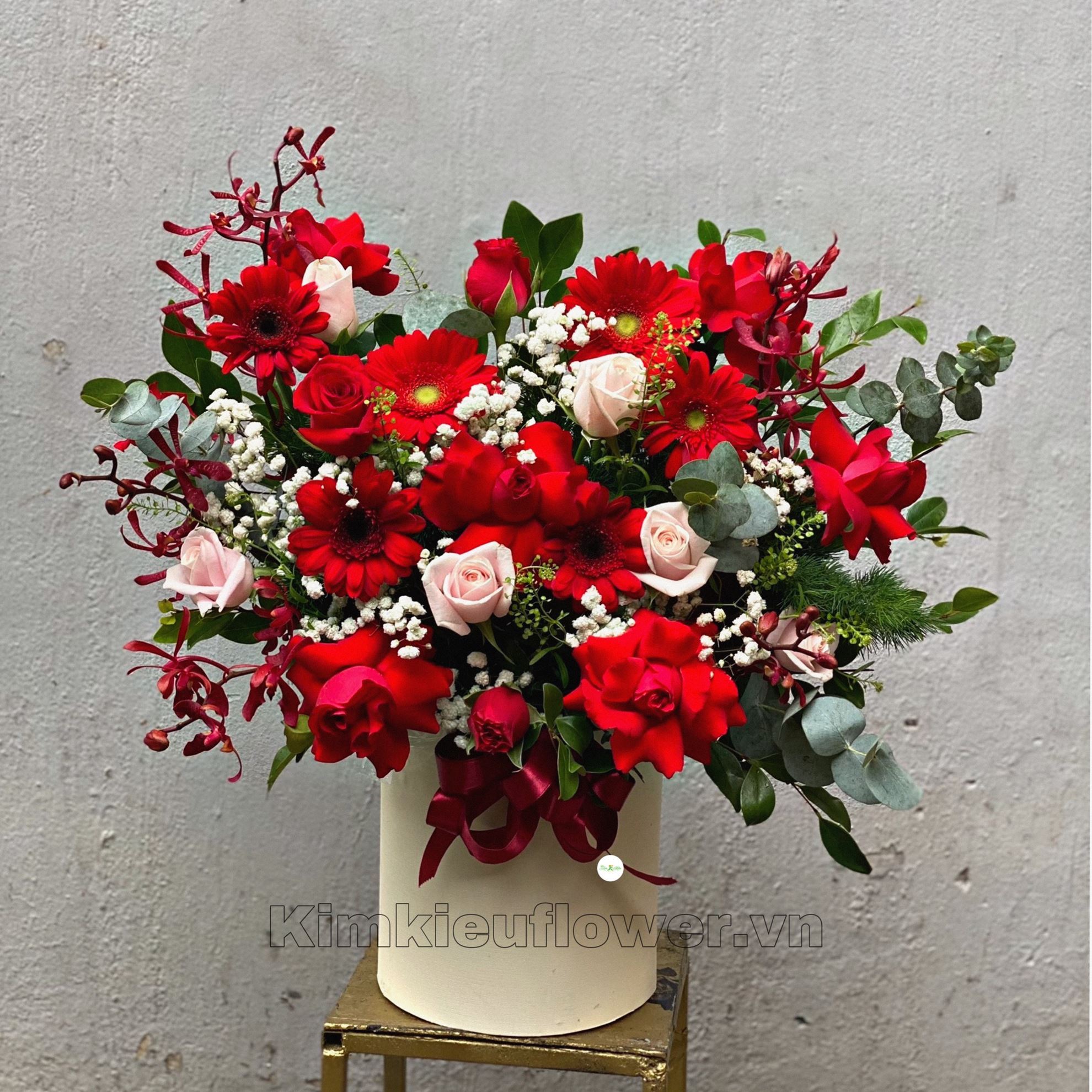 Mẫu HG369 gồm các loại hoa: + 9 hoa hồng đỏ eku (6 lận, 3 không lận) + 6 hoa hồng kem + 5 lan đỏ + 6 đồng tiền đỏ + và các lá phụ khác - Liên hệ KIM KIỀU FLOWER để tư vấn thiết kế mẫu hoa theo yêu cầu bạn nhé!