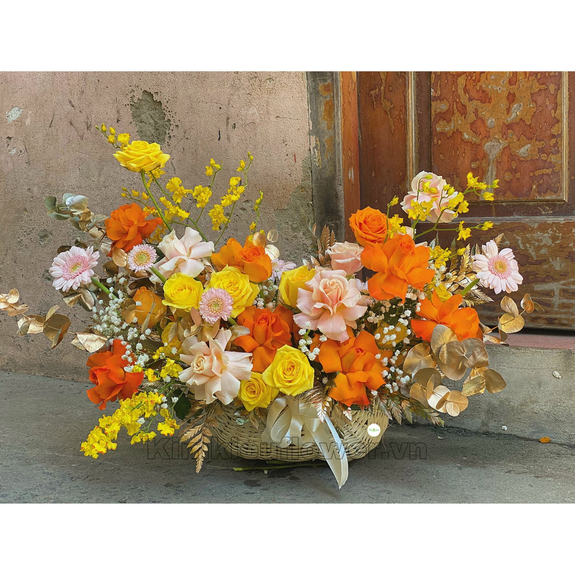 Mẫu HG354 gồm các loại hoa: + hoa hồng vàng + hoa hồng cam + lan vũ nữ + đồng tiền nhí + hoa hồng wlend + và các lá phụ khác - Liên hệ KIM KIỀU FLOWER để tư vấn thiết kế mẫu hoa theo yêu cầu bạn nhé!