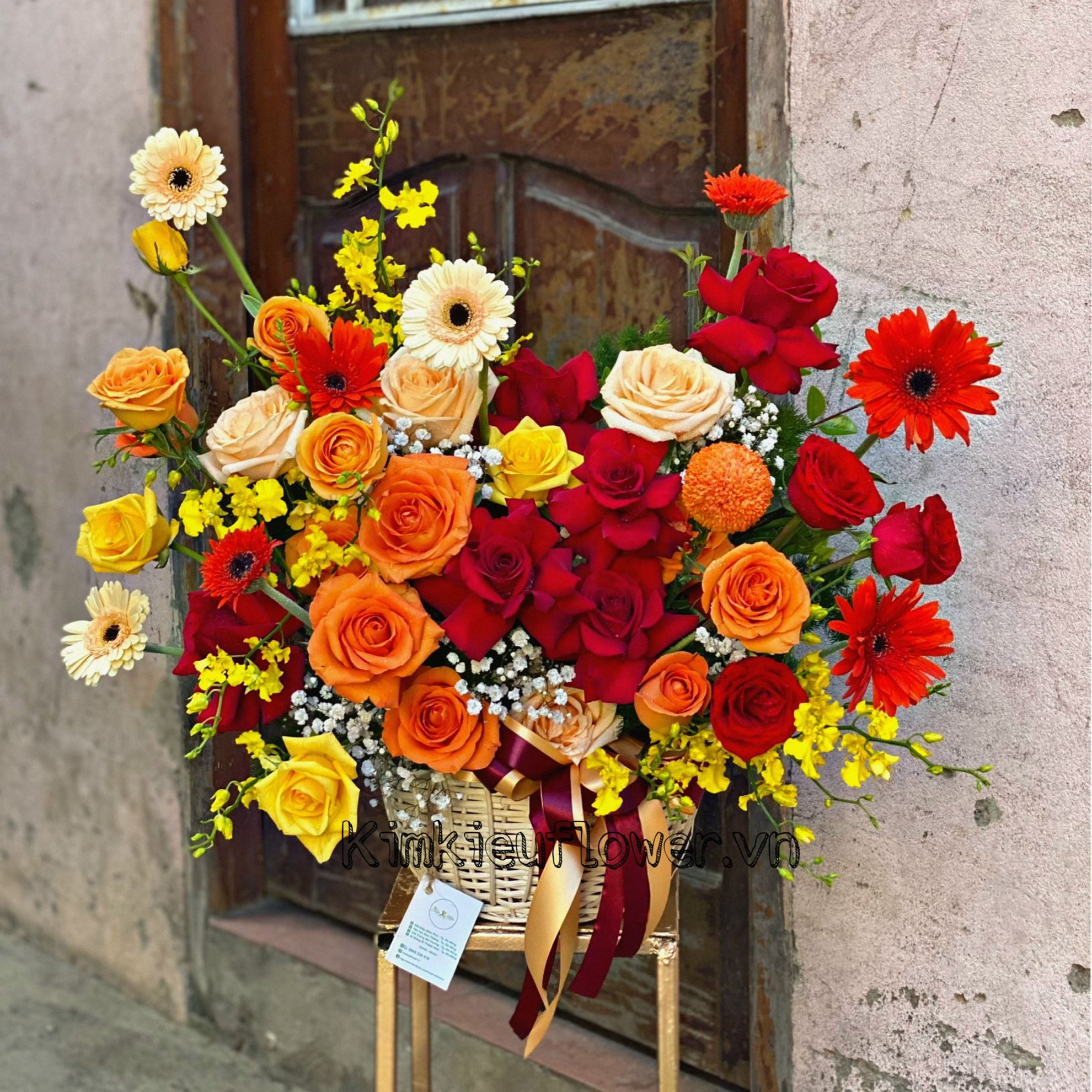 Mẫu HG394 gồm các loại hoa: + hoa hồng đỏ + hoa hồng cam + hoa hồng vàng + hoa hồng mỡ gà + đồng tiền + lan vũ nữ + và các lá phụ khác - Liên hệ KIM KIỀU FLOWER để tư vấn thiết kế mẫu hoa theo yêu cầu bạn nhé!