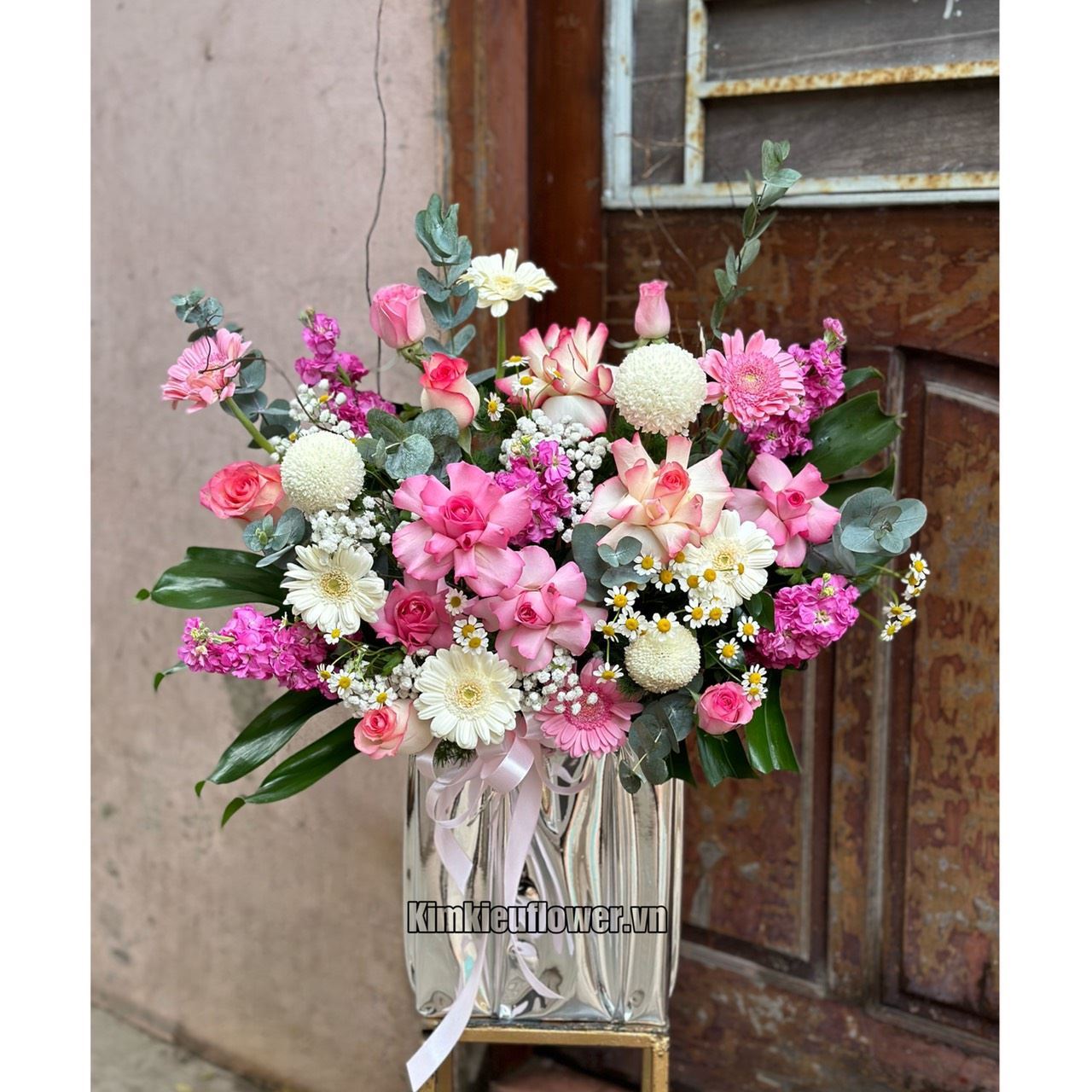 Mẫu HG547 gồm các loại hoa: + hoa hồng dâu + hoa hồng hỷ trứng + hoa pingpong + đồng tiền nhí + và các lá phụ khác - Liên hệ KIM KIỀU FLOWER để tư vấn thiết kế mẫu hoa theo yêu cầu bạn nhé!