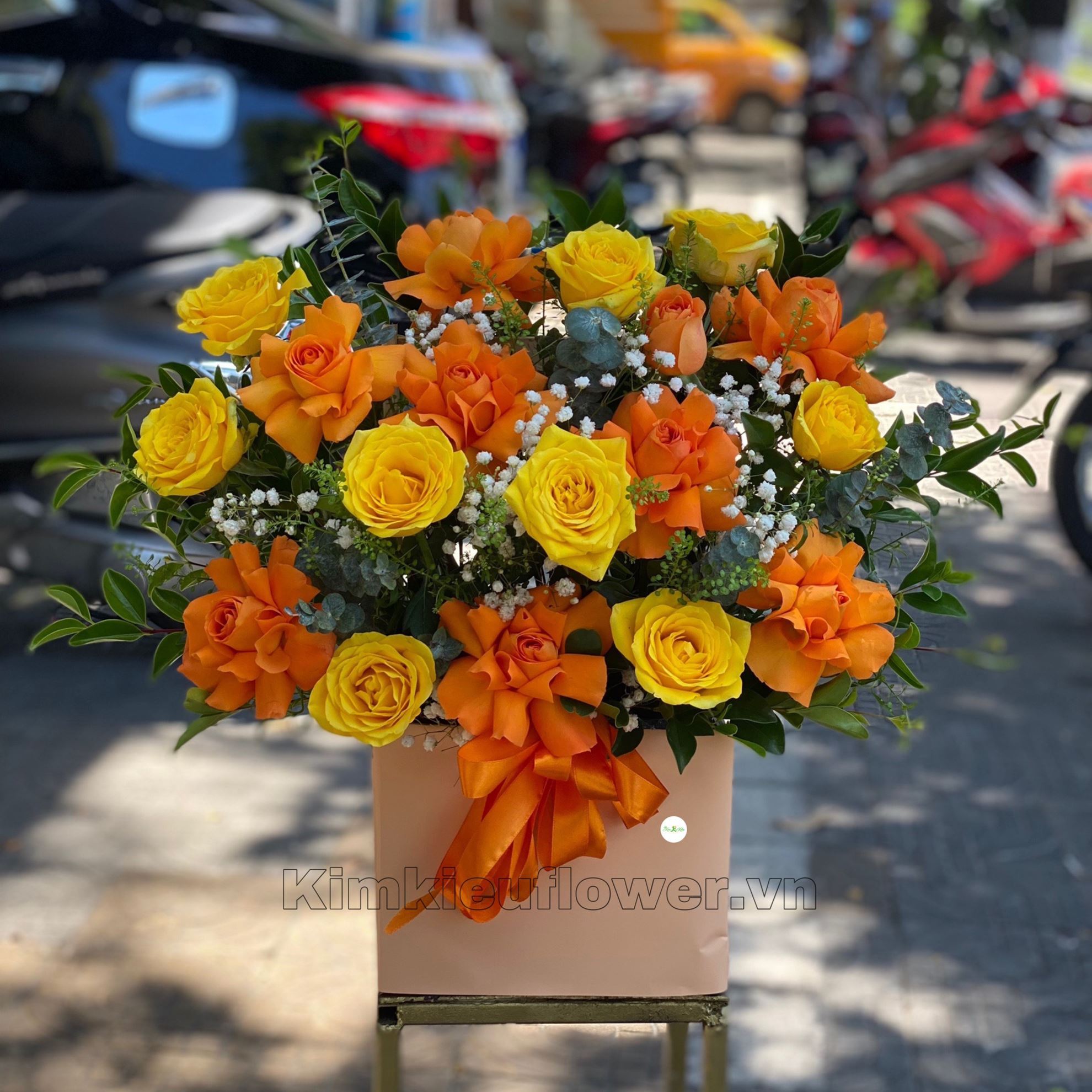 Mẫu HG356 gồm các loại hoa: + hoa hồng vàng + hoa hồng cam + và các lá phụ khác - Liên hệ KIM KIỀU FLOWER để tư vấn thiết kế mẫu hoa theo yêu cầu bạn nhé!