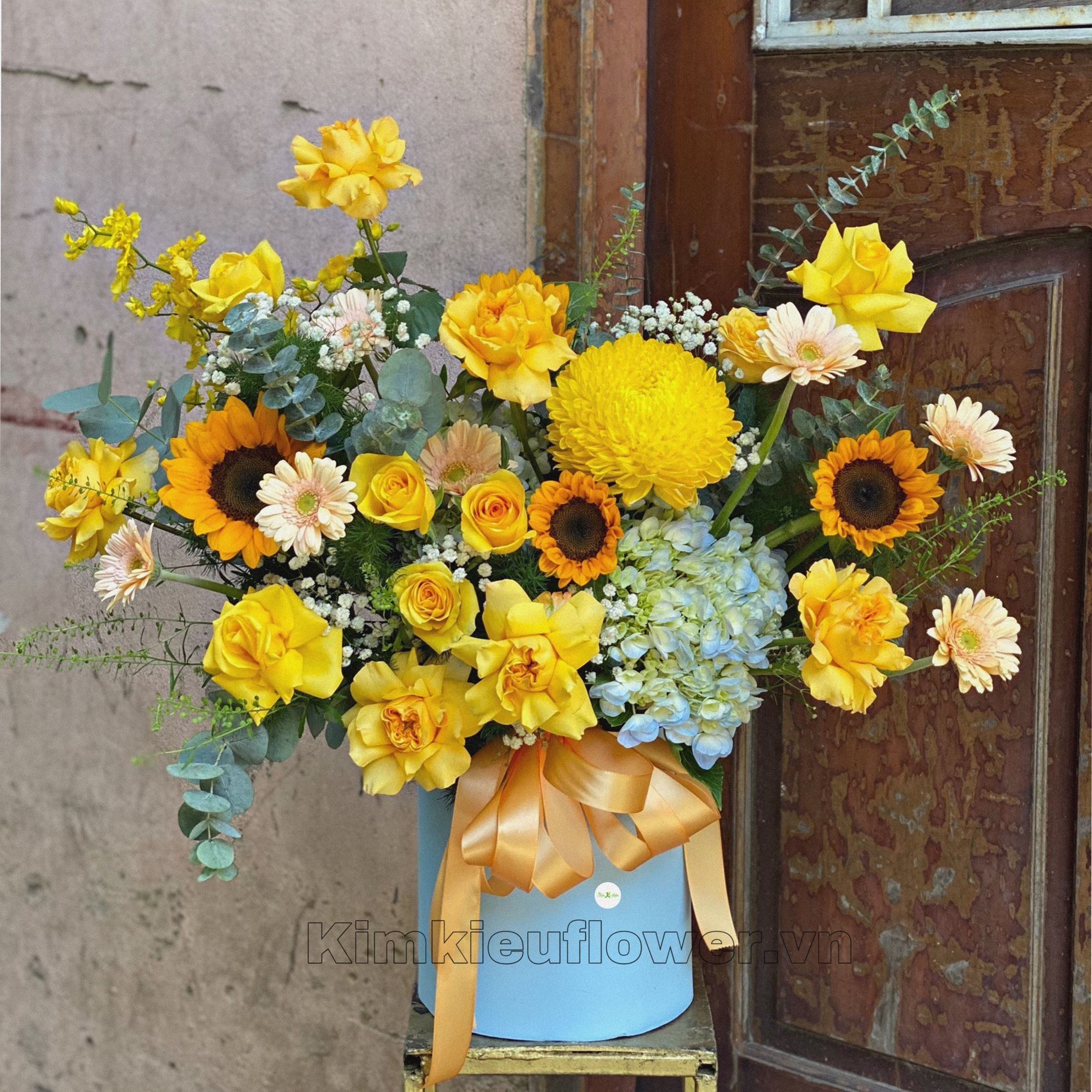 Mẫu HG362 gồm các loại hoa: + 13 hoa hồng vàng ( 8 lận - 5 không lận ) + 1 cúc mẫu đơn vàng + 7 đồng tiền nhí cà rốt + 4 hướng dương + 2 cẩm tú cầu + lan vũ nữ + và các lá phụ khác - Liên hệ KIM KIỀU FLOWER để tư vấn thiết kế mẫu hoa theo yêu cầu bạn nhé!