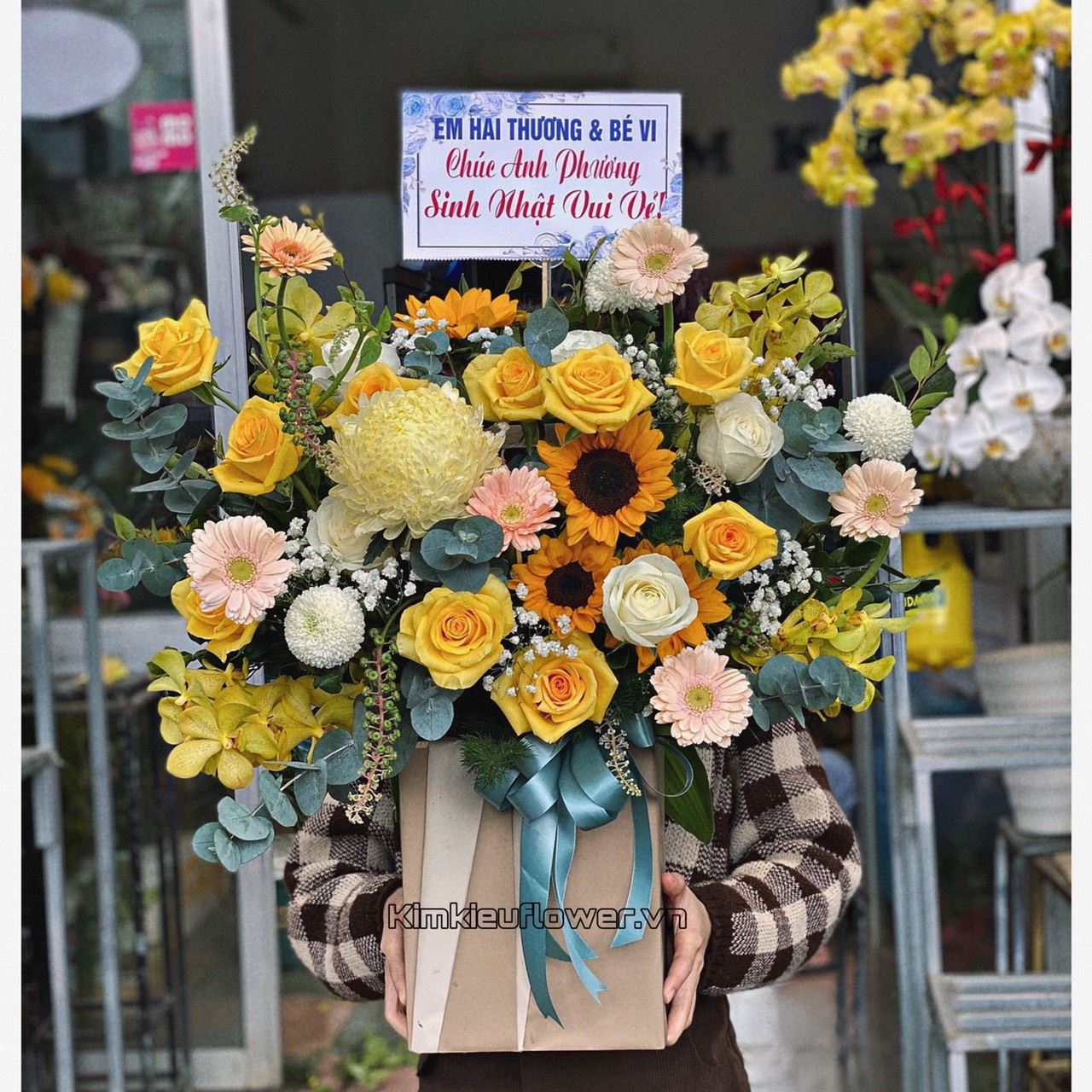Mẫu HG539 gồm các loại hoa: + 1 cúc mẫu đơn + hoa hướng dương + lan vàng + hoa hồng trắng + hoa hồng vàng + đồng tiền nhí + và các lá phụ khác - Liên hệ KIM KIỀU FLOWER để tư vấn thiết kế mẫu hoa theo yêu cầu bạn nhé!