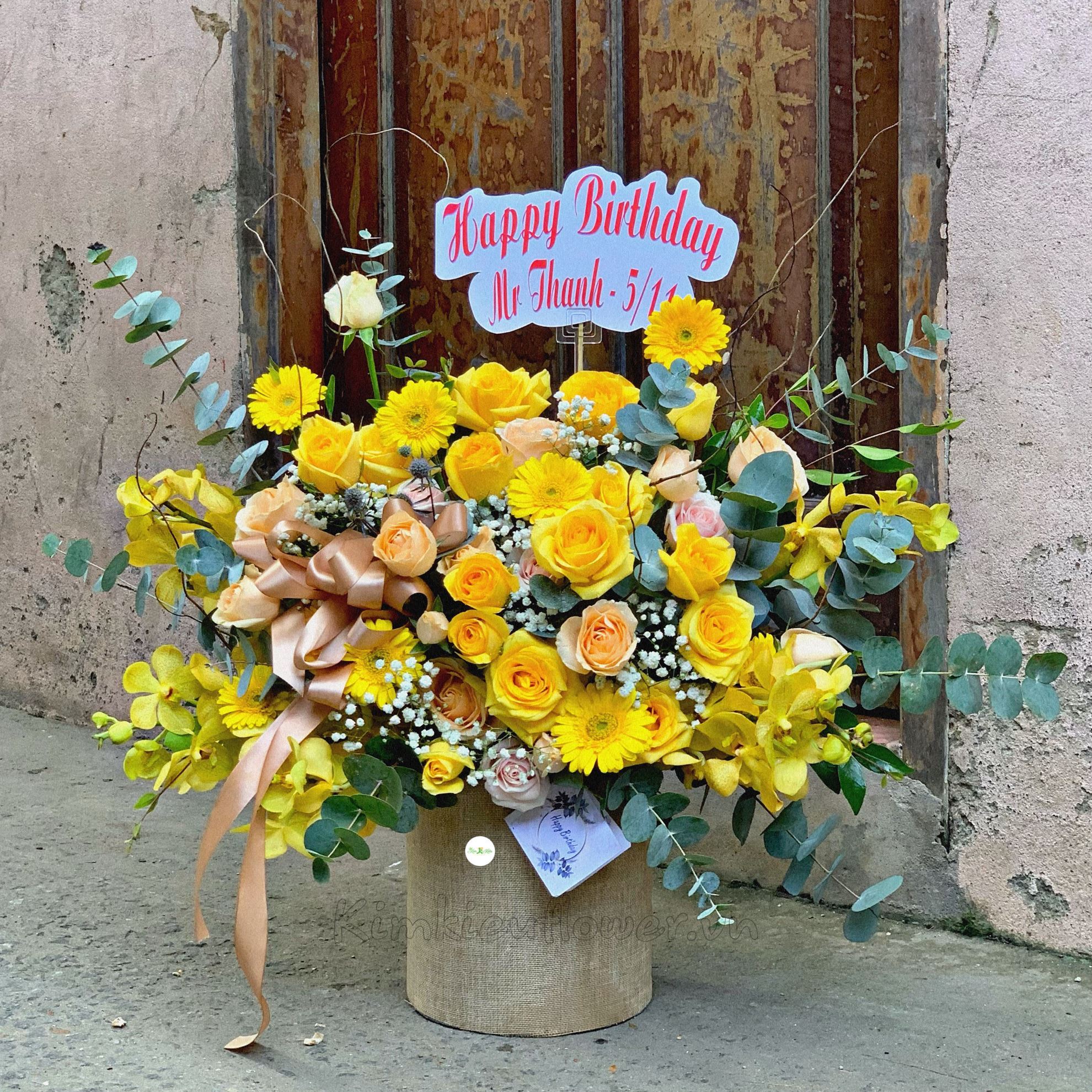 Mẫu HG288 gồm các loại hoa: + hoa hồng vàng + hoa hồng mỡ gà + đồng tiền vàng + lan vàng + và các hoa,lá phụ khác - Liên hệ KIM KIỀU FLOWER để tư vấn thiết kế mẫu hoa theo yêu cầu bạn nhé!