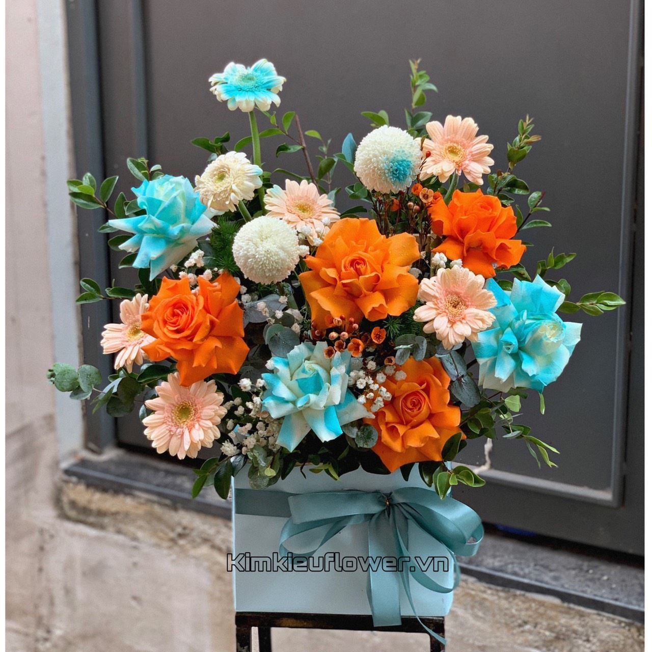 Mẫu HG523 gồm các loại hoa: + 3 hoa hồng xanh xịt + 4 hoa hồng cam lận cánh + 2 pingpong trắng + 5 đồng tiền nhí cà rốt, 2 đồng tiền nhí trắng + và các lá phụ khác - Liên hệ KIM KIỀU FLOWER để tư vấn thiết kế mẫu hoa theo yêu cầu bạn nhé!