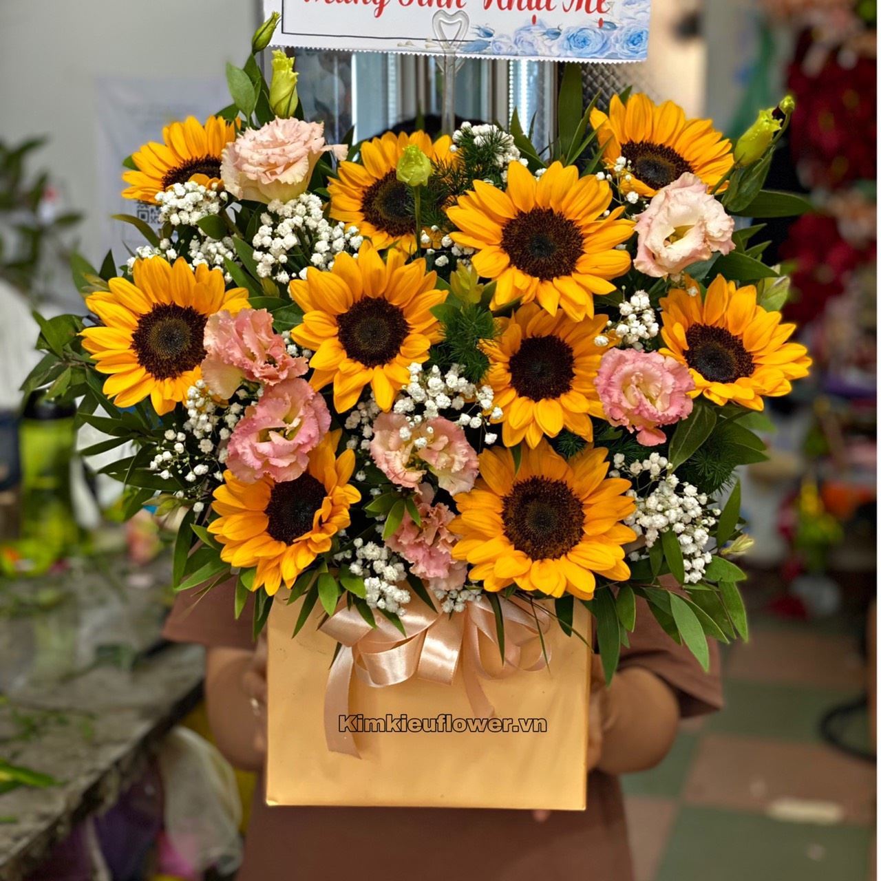 Mẫu HG582 gồm các loại hoa: + hoa hướng dương + cát tường xoắn + và các lá phụ khác - Liên hệ KIM KIỀU FLOWER để tư vấn thiết kế mẫu hoa theo yêu cầu bạn nhé!