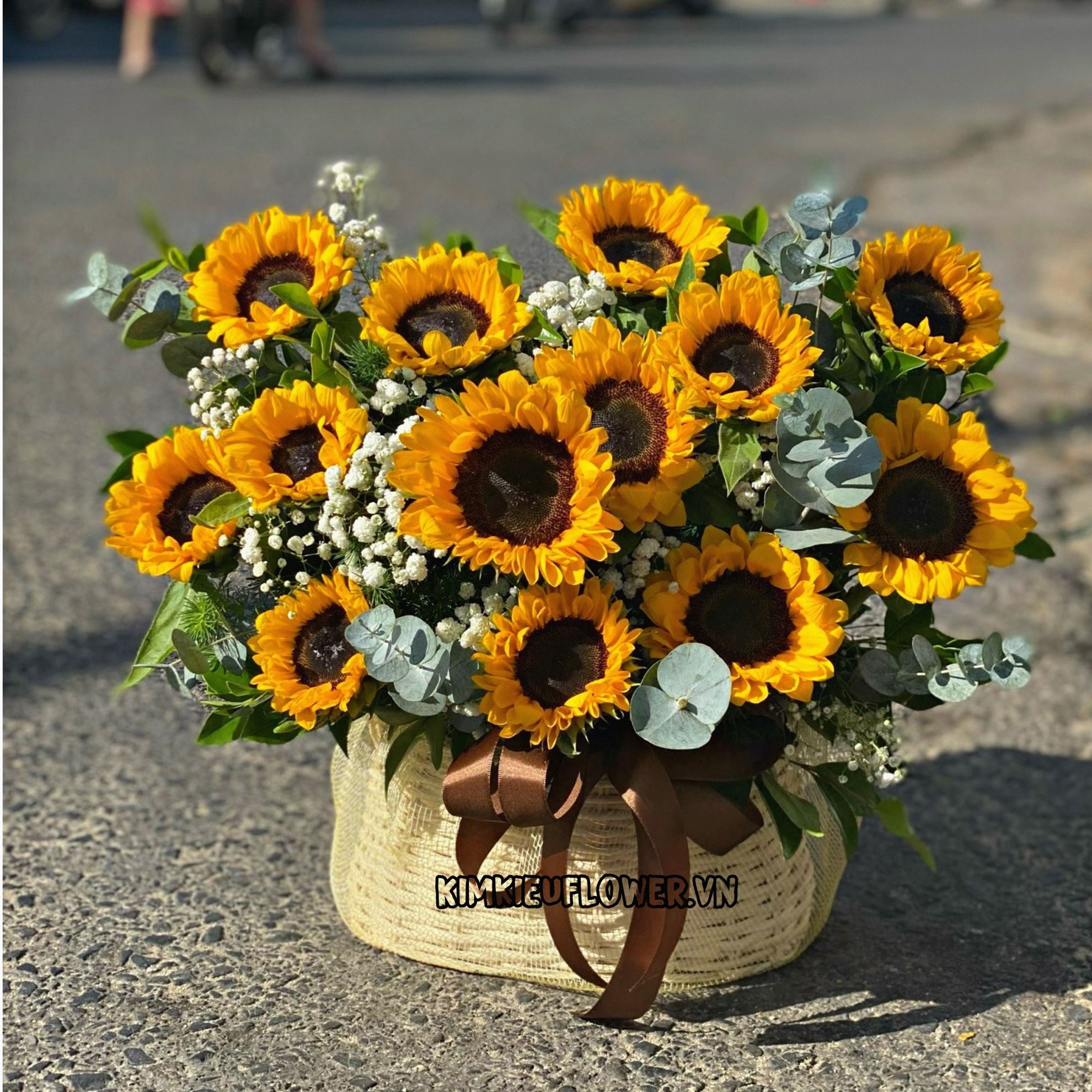 Giỏ hoa HG722 gồm: + 13 Hoa hướng dương + và các lá phụ khác - Liên hệ KIM KIỀU FLOWER để tư vấn thiết kế mẫu hoa theo yêu cầu bạn nhé!
