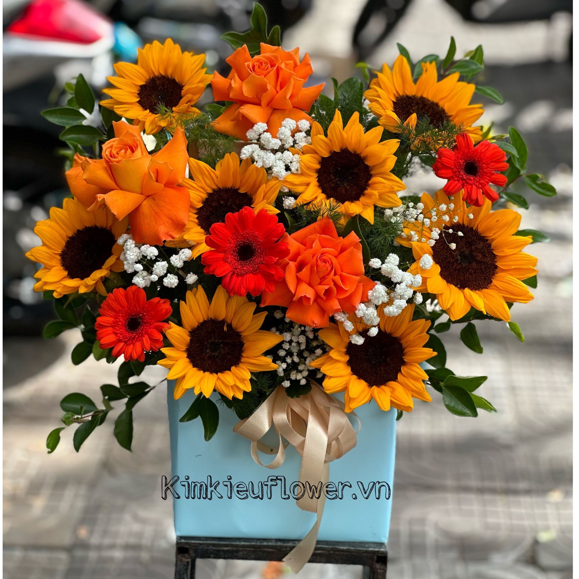 Mẫu HG410 gồm các loại hoa: + 8 hoa hướng dương + 3 hoa hồng cam lận cánh + 3 đồng tiền nhí cam + và các lá phụ khác - Liên hệ KIM KIỀU FLOWER để tư vấn thiết kế mẫu hoa theo yêu cầu bạn nhé!