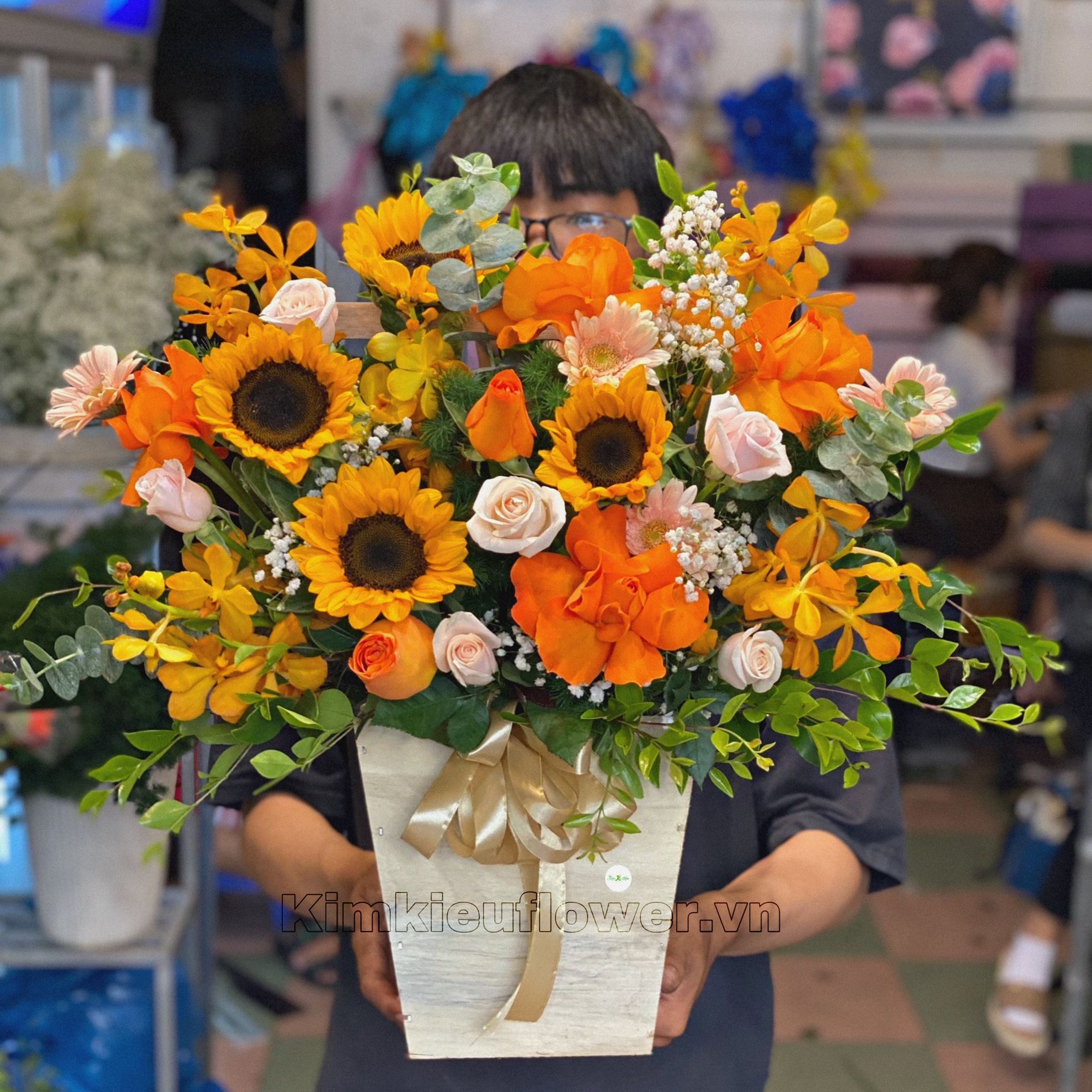 Mẫu HG340 gồm các loại hoa: + hoa hướng dương + hồng cam quốc vương + lan vàng + hồng kem + đồng tiền nhí + và các lá phụ khác - Liên hệ KIM KIỀU FLOWER để tư vấn thiết kế mẫu hoa theo yêu cầu bạn nhé!
