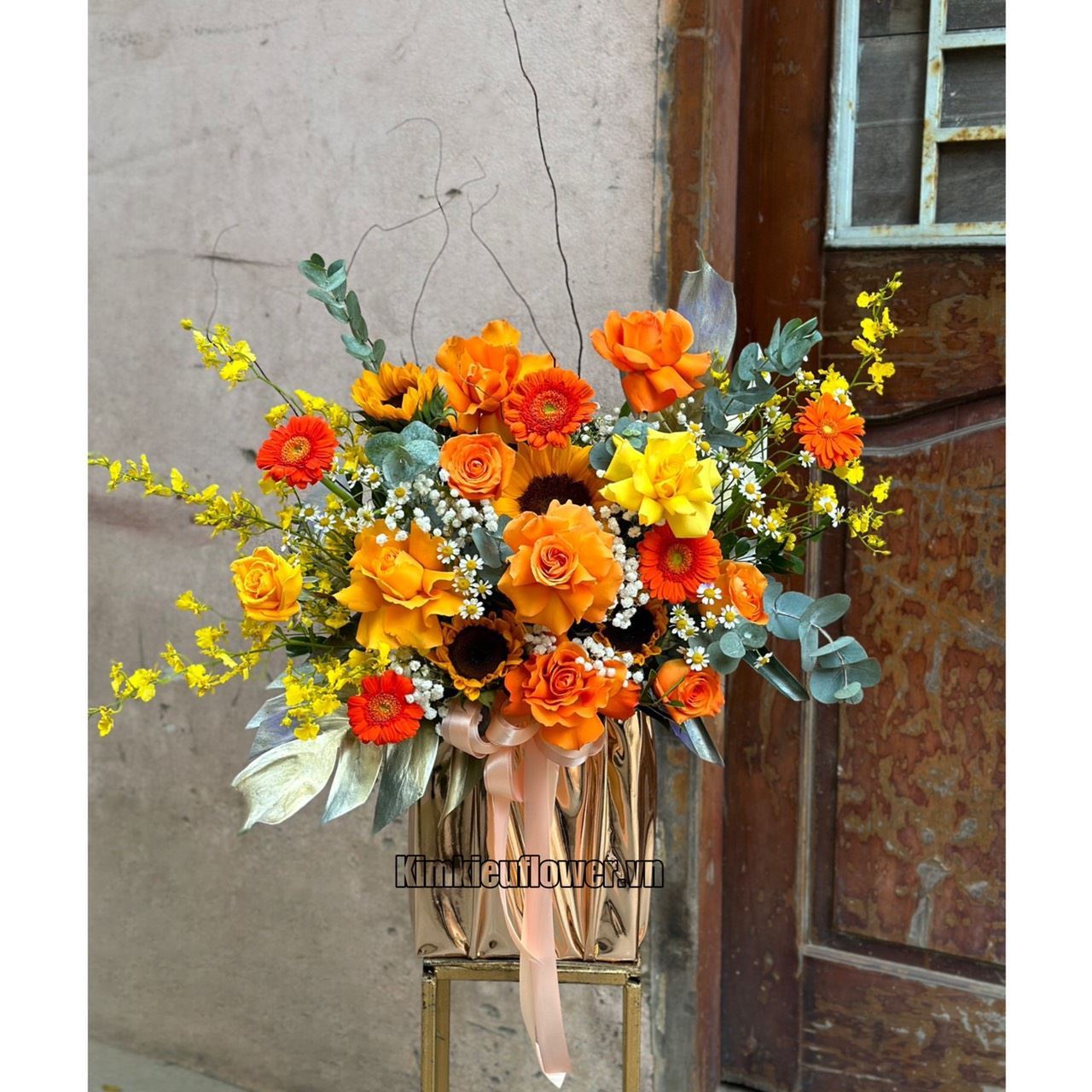 Mẫu HG549 gồm các loại hoa: + hoa hồng cam + hoa hướng dương + lan vũ nữ + đồng tiền nhí + và các lá phụ khác - Liên hệ KIM KIỀU FLOWER để tư vấn thiết kế mẫu hoa theo yêu cầu bạn nhé!