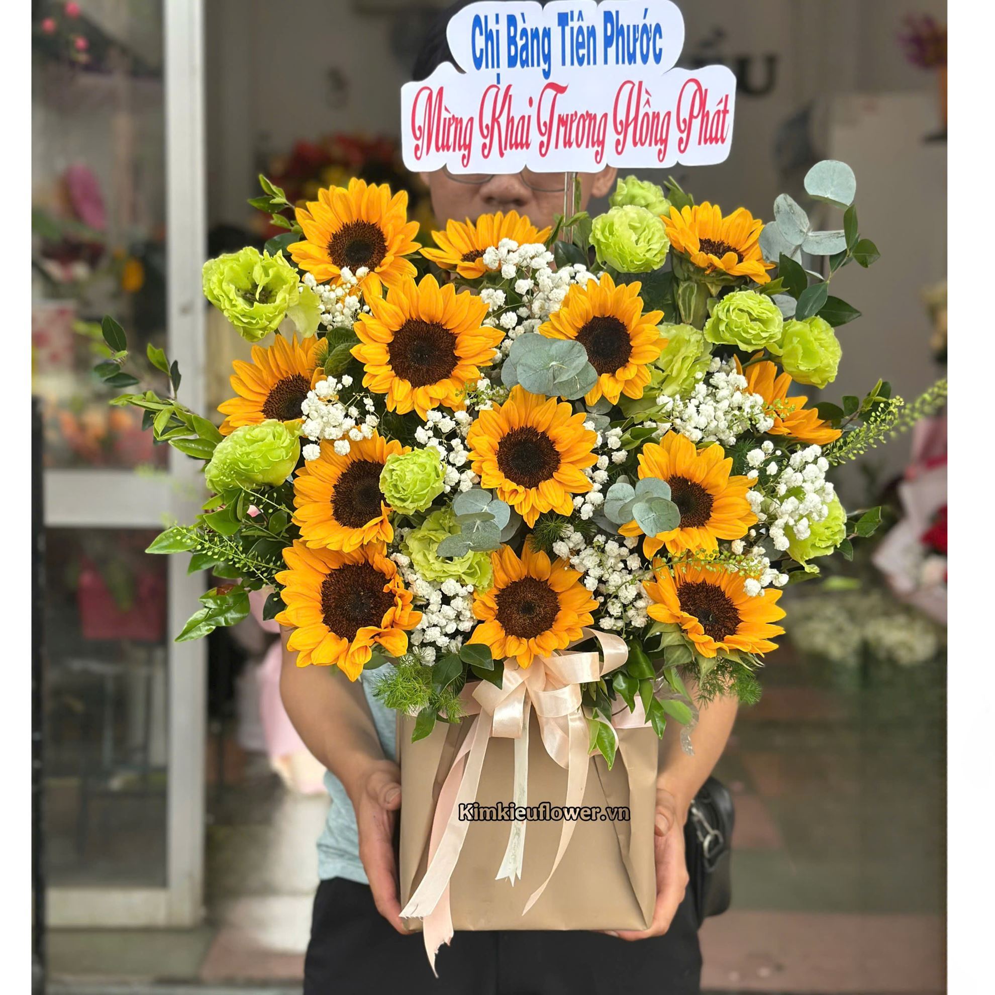 Mẫu HG877 gồm các loại hoa: + 13 hoa hướng dương + cát tường xanh + và các lá phụ khác - Liên hệ KIM KIỀU FLOWER để tư vấn thiết kế mẫu hoa theo yêu cầu bạn nhé!