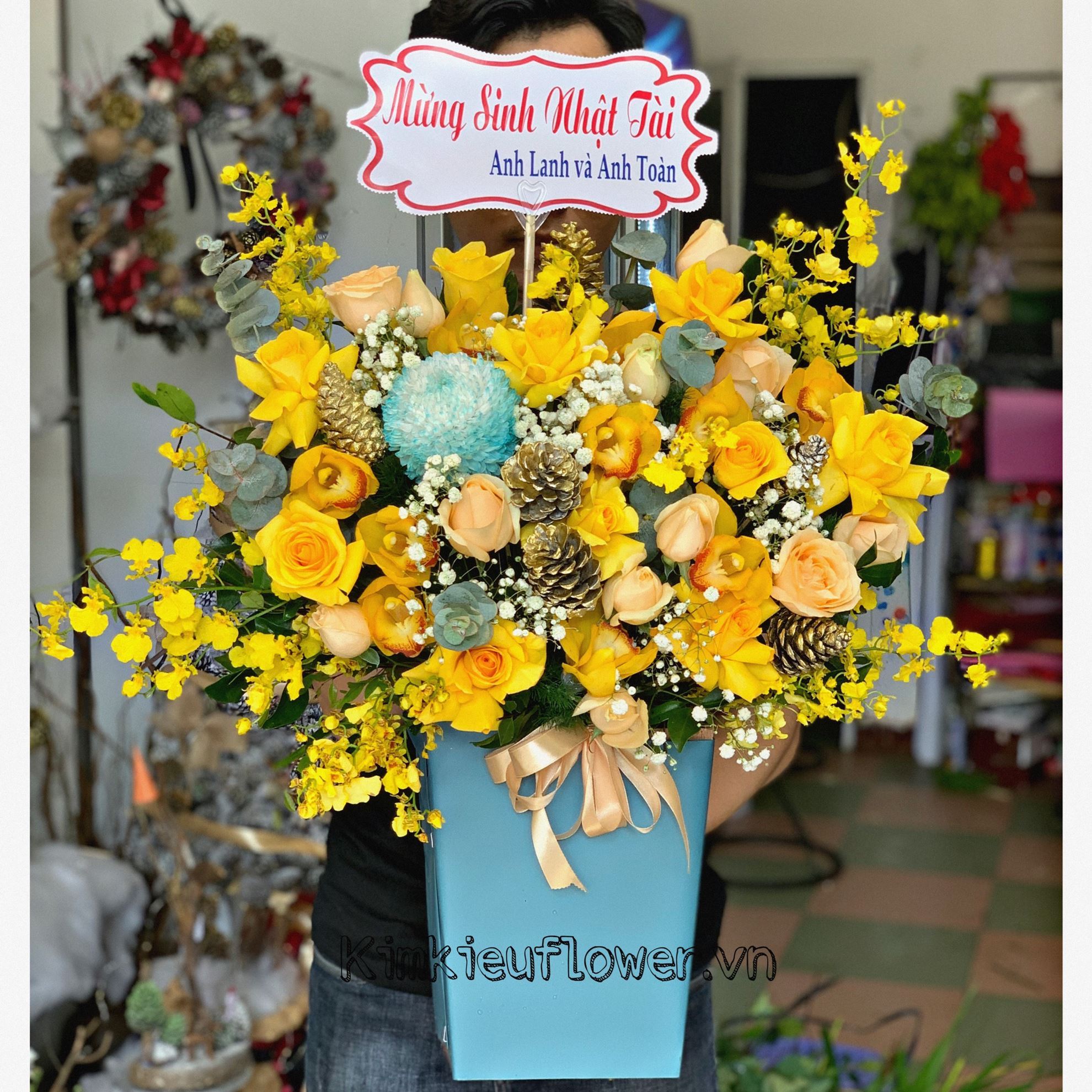 Mẫu HG508 gồm các loại hoa: + hoa hồng vàng + hoa hồng mỡ gà + lan vũ nữ + cúc mẫu đơn xanh + đồng tiền nhí + à các lá phụ khác - Liên hệ KIM KIỀU FLOWER để tư vấn thiết kế mẫu hoa theo yêu cầu bạn nhé!