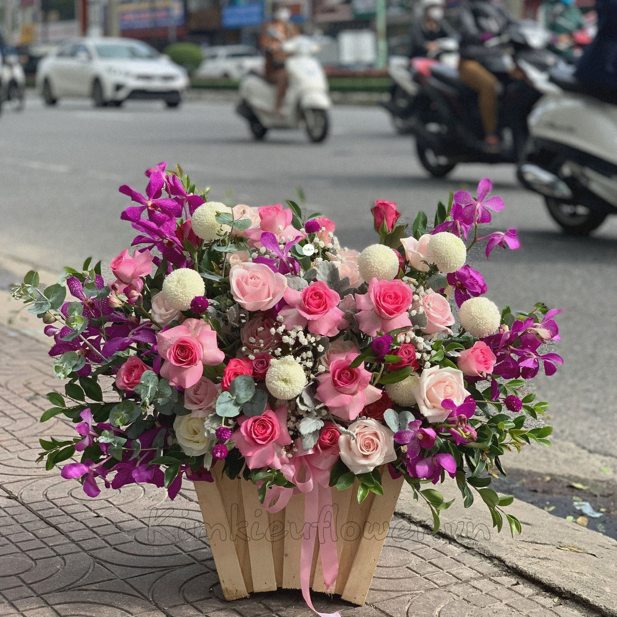 Mẫu HG151 gồm các loại hoa: + hoa hồng dâu + ping pong trắng + lan tím + hồng kem + và các lá phụ khác- Liên hệ KIM KIỀU FLOWER để tư vấn thiết kế mẫu hoa theo yêu cầu bạn nhé!