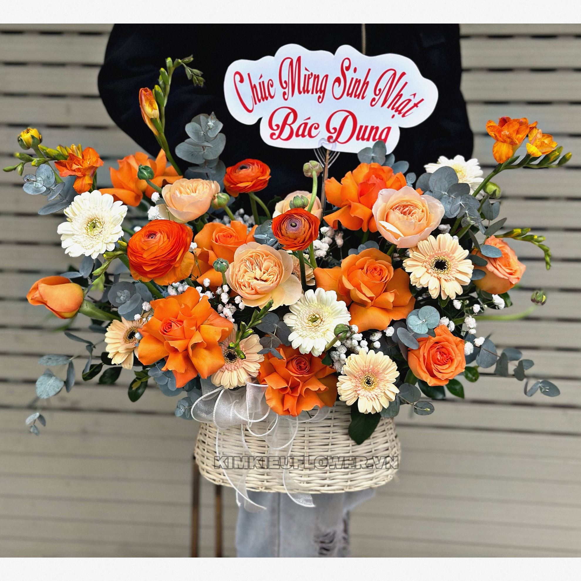 Giỏ hoa HG665 gồm: + 9 hoa hồng cam quốc vương ( 6 lận - 3 không lận ) + 3 hoa hồng juliet + mao lương cam + 4 hoa đồng tiền trứng + 3 đồng tiền trắng + hoa dơn lúa + và các hoa, lá phụ khác - Liên hệ KIM KIỀU FLOWER để tư vấn thiết kế mẫu hoa theo yêu cầu bạn nhé!