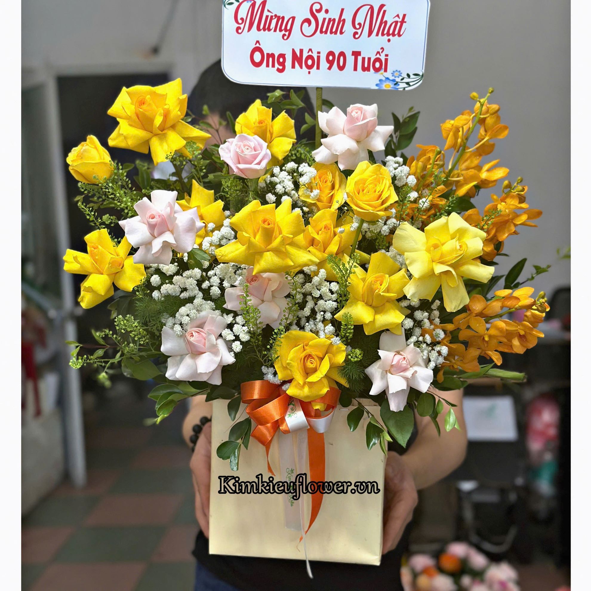 Mẫu HG743 gồm các loại hoa: + 3 lan mokara vàng + 12 hoa hồng vàng (9 lận - 3 không lận) + 6 hoa hồng kem (5 lận - 1 không lận) + và các lá phụ khác - Liên hệ KIM KIỀU FLOWER để tư vấn thiết kế mẫu hoa theo yêu cầu bạn nhé!