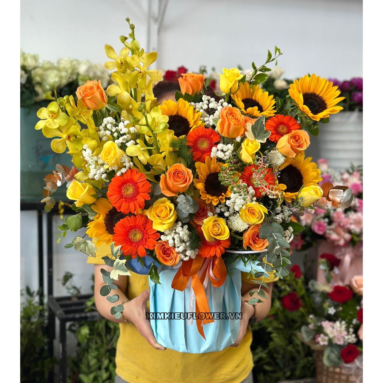 Mẫu HG700 gồm các loại hoa: + 3 lan vàng + 6 hướng dương + 8 hoa hồng vàng + 8 hoa hồng cam + 6 đồng tiền nhí cam + và các lá phụ khác - Liên hệ KIM KIỀU FLOWER để tư vấn thiết kế mẫu hoa theo yêu cầu bạn nhé