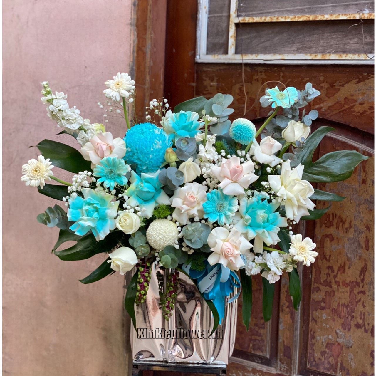 Mẫu HG544 gồm các loại hoa: + hoa hồng trắng + hoa hồng xịt xanh + phi yến trắng + pingpong trắng + cúc mẫu đơn xanh + và các lá phụ khác - Liên hệ KIM KIỀU FLOWER để tư vấn thiết kế mẫu hoa theo yêu cầu bạn nhé!
