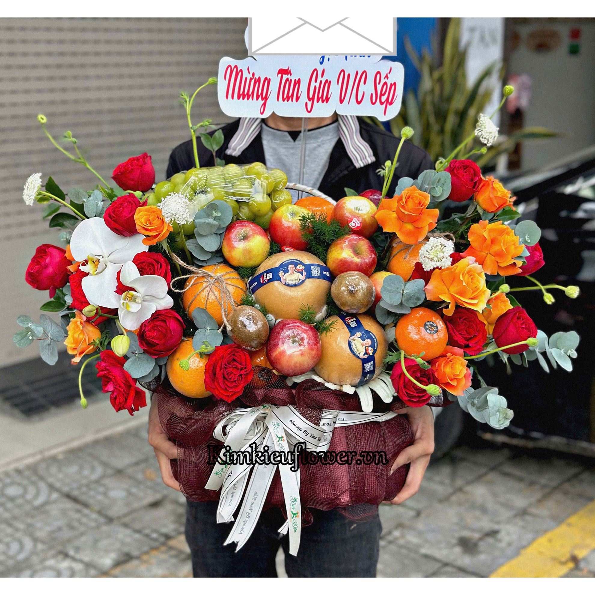 Mẫu HTC21 gồm các loại hoa: + Trái cây theo thời giá + Hoa hồng đỏ pháp + Hoa hồng cam spirit + và các lá phụ khác - Liên hệ KIM KIỀU FLOWER để tư vấn thiết kế mẫu hoa theo yêu cầu bạn nhé!