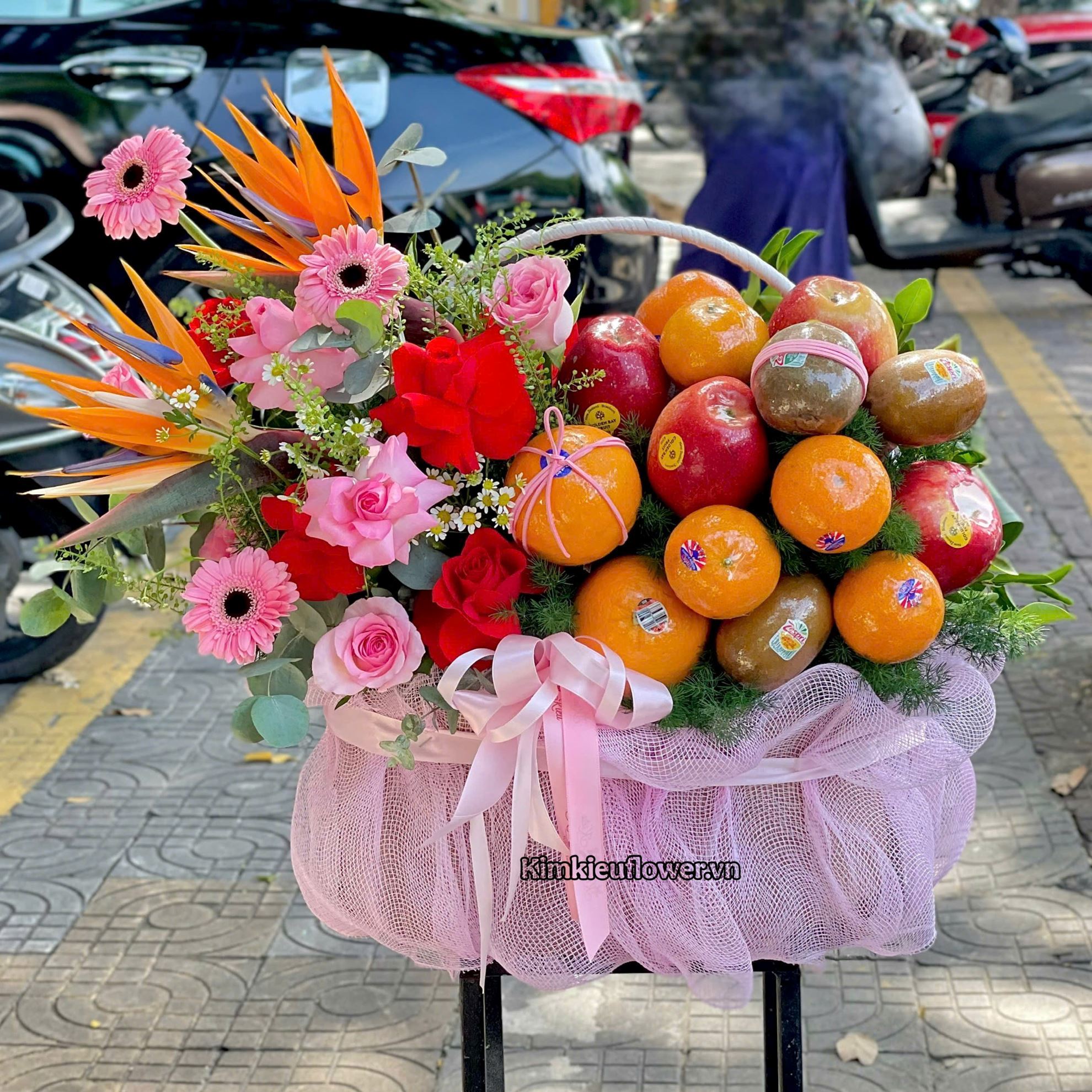 Giỏ hoa trái cây tone hồng cam - HTC31