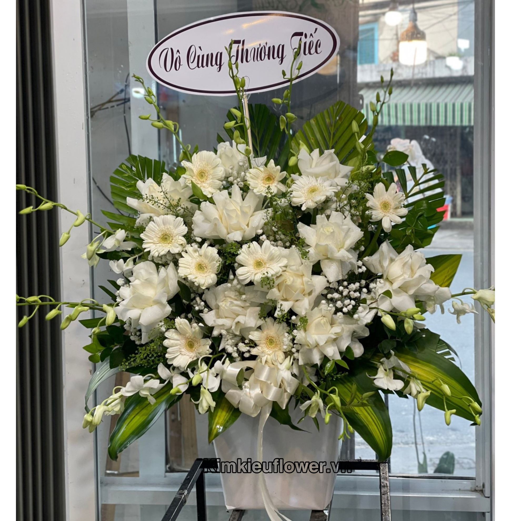 Mẫu GV06 gồm các loại hoa: + hoa hồng trắng + đồng tiền trắng + lan trắng + và các lá phụ khác - Liên hệ KIM KIỀU FLOWER để tư vấn thiết kế mẫu hoa theo yêu cầu bạn nhé!