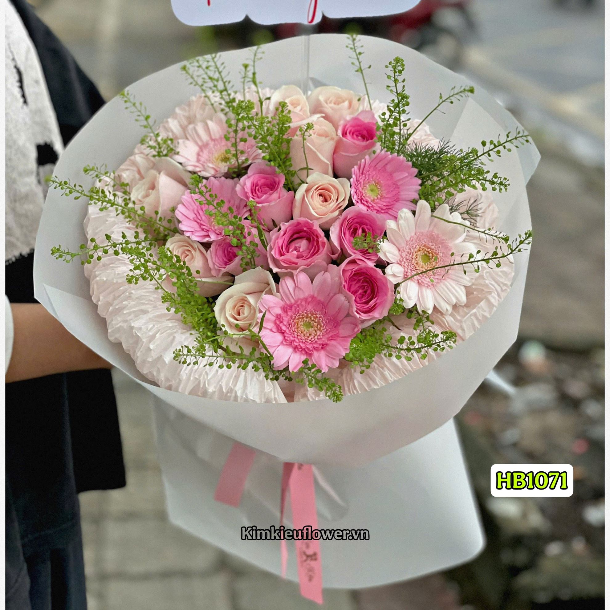 Bó hoa chúc mừng tone hồng mix cỏ đồng tiền - HB1071