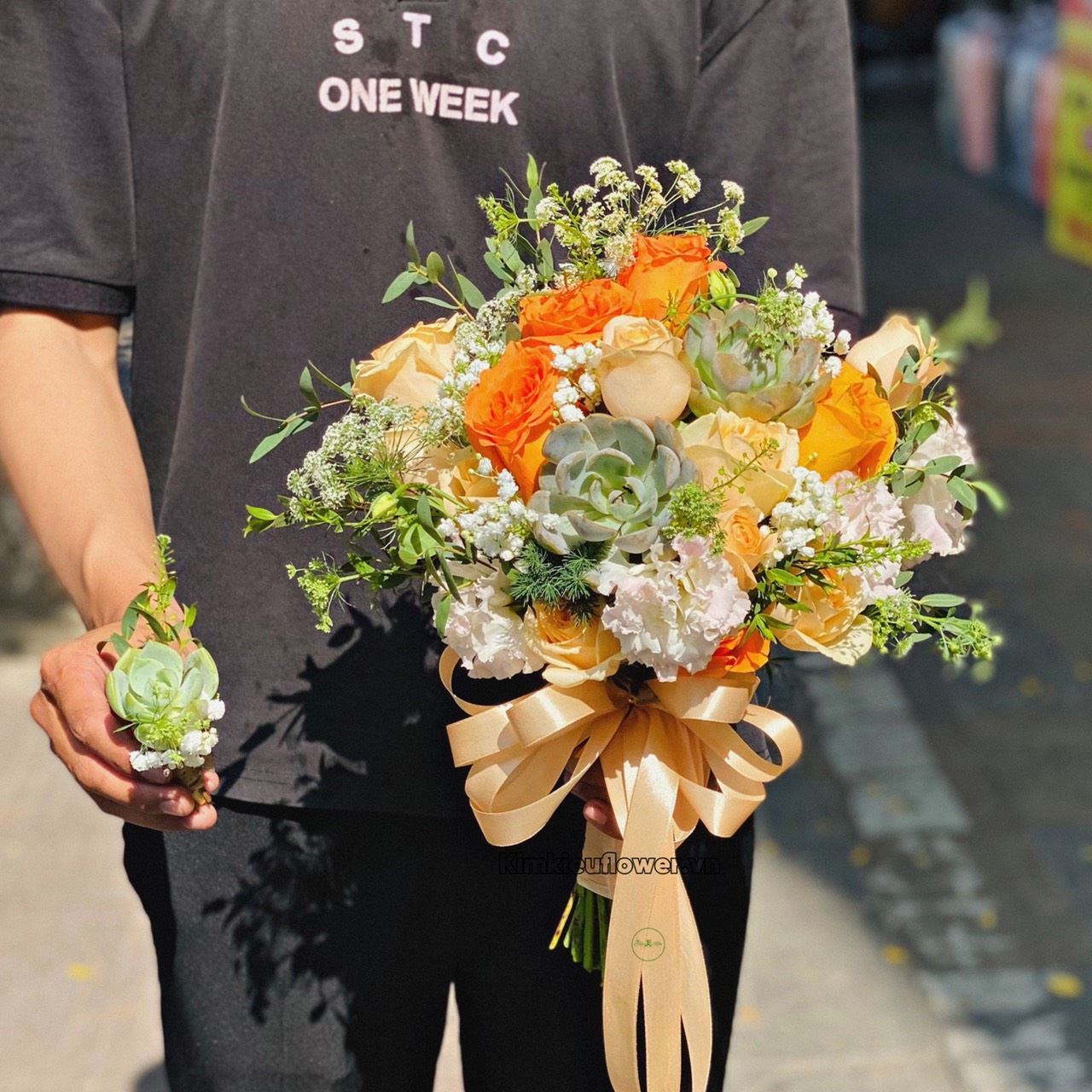 Mẫu HC75 gồm các loại hoa: + hoa sen đá + cát tường xoắn + hoa hồng cam + hoa hồng trứng + và các lá phụ khác- Liên hệ KIM KIỀU FLOWER để tư vấn thiết kế mẫu hoa theo yêu cầu bạn nhé!