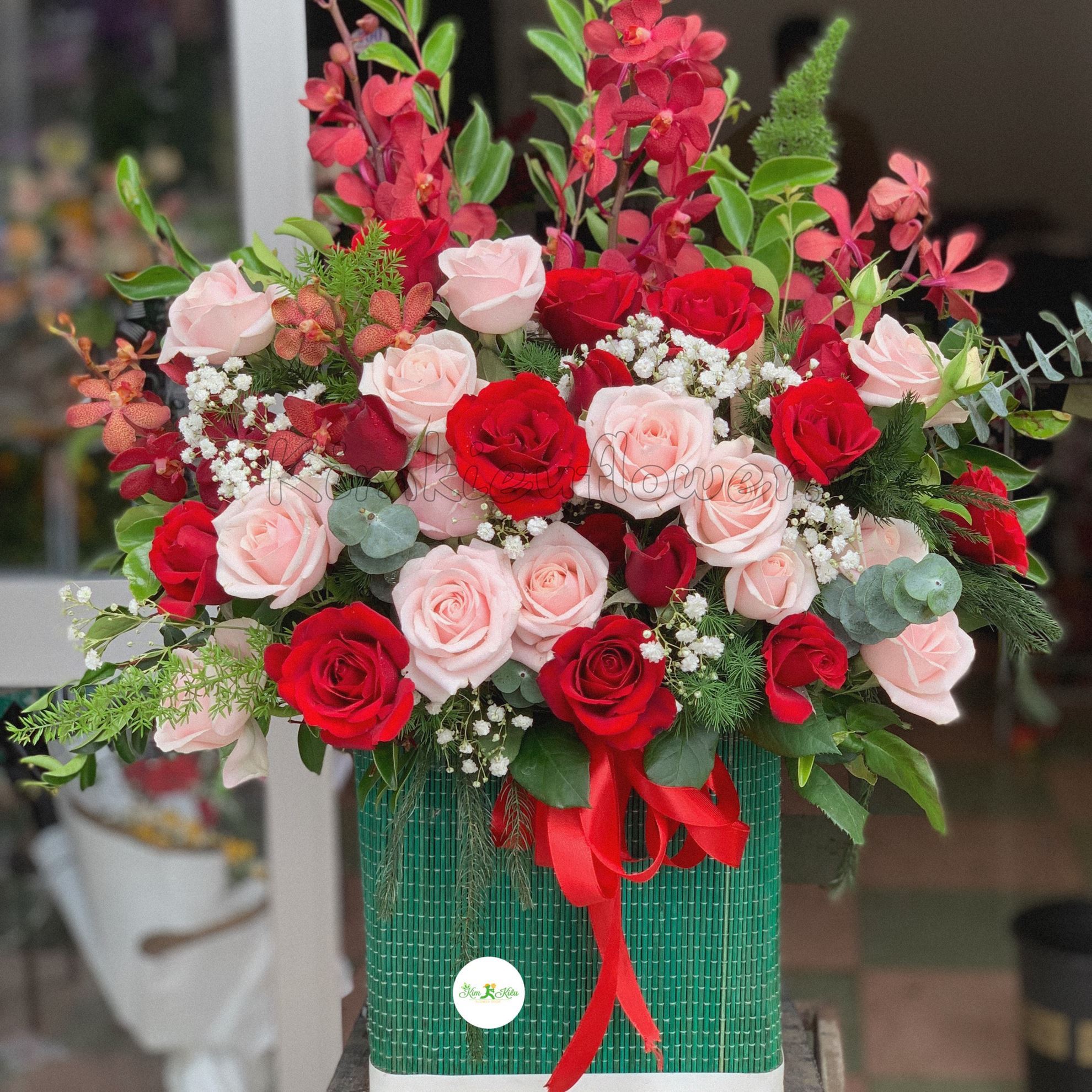 Hoa giỏ hồng kem,đỏ,lan đỏ-HG124