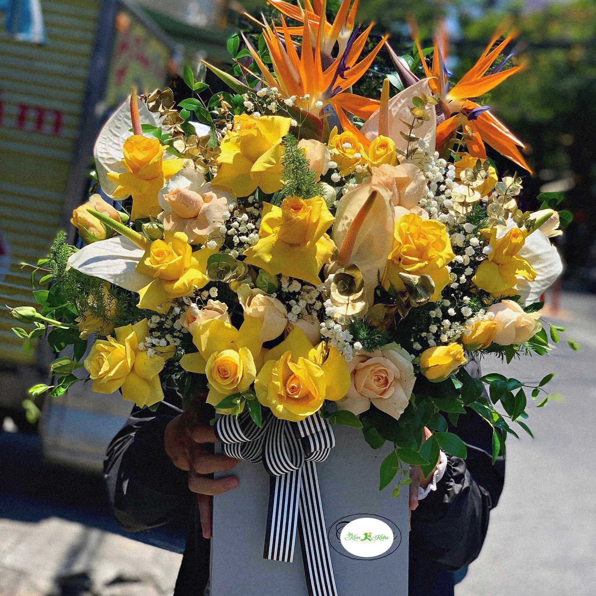Mẫu HG32: Được cắm từ những bông hoa hồng vàng tươi nhất và điểm tô bởi những cây thiên điểu và huyết môn trắng xinh xắn, lẵng hoa khoe sắc rực rỡ và mang đầy sức sống. Đây sẽ là món quà vô cùng phù hợp nếu như bạn muốn tạo một ấn tượng đến đối tác, đồng nghiệp, bạn bè, hay những người mà bạn thương yêu quan tâm nhất. - Mẫu HG32 gồm các loại hoa: + hoa hồng vàng + hoa thiên điểu + huyết môn trắng + và các hoa,lá phụ khác - Liên hệ KIM KIỀU FLOWER để tư vấn thiết kế mẫu hoa theo yêu cầu bạn nhé!
