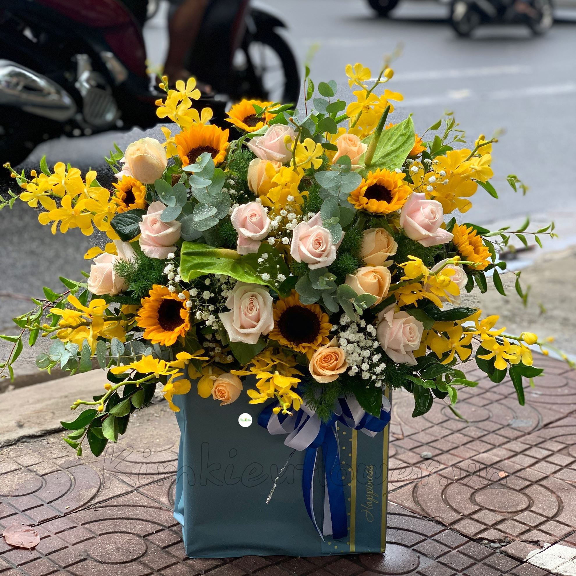 Mẫu HG142 : gồm các loại hoa: + hoa hồng kem + hoa hồng vàng + lan vàng mokara + hướng dương + huyết môn xanh + và các hoa,lá phụ khác - Liên hệ KIM KIỀU FLOWER để tư vấn thiết kế mẫu hoa theo yêu cầu bạn nhé!