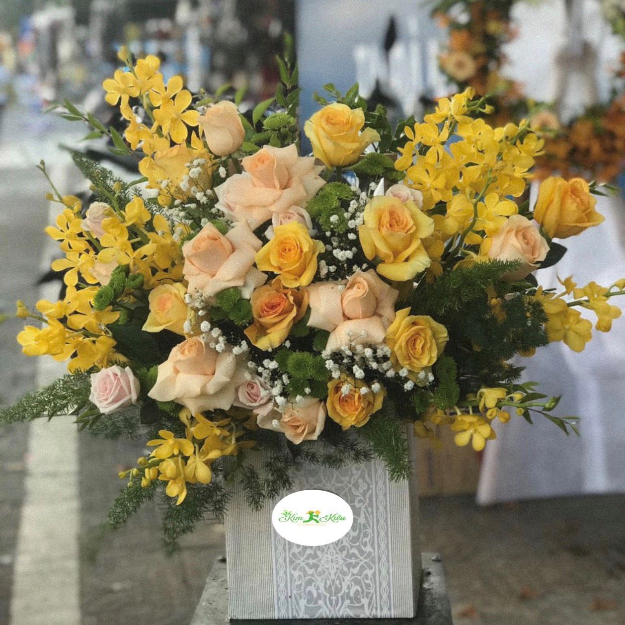 Mẫu HG03: được thiết kế theo tone màu vàng đầy tươi sáng bởi những bông hồng vàng với lan vàng chanh. Trong những dịp khai trương, kỉ niệm, chúc mừng hãy gửi đến bạn bè, đối tác, đồng nghiệp lời chúc may mắn đầy hân hoan và chân thành nhất thông qua hộp hoa đầy sắc màu này nhé. - Mẫu HG03 gồm các loại hoa: + hoa hồng vàng đà lạt + hoa hồng mỡ gà + lan vàng chanh + và các hoa,lá phụ khác - Liên hệ KIM KIỀU FLOWER để tư vấn thiết kế mẫu hoa theo yêu cầu bạn nhé!