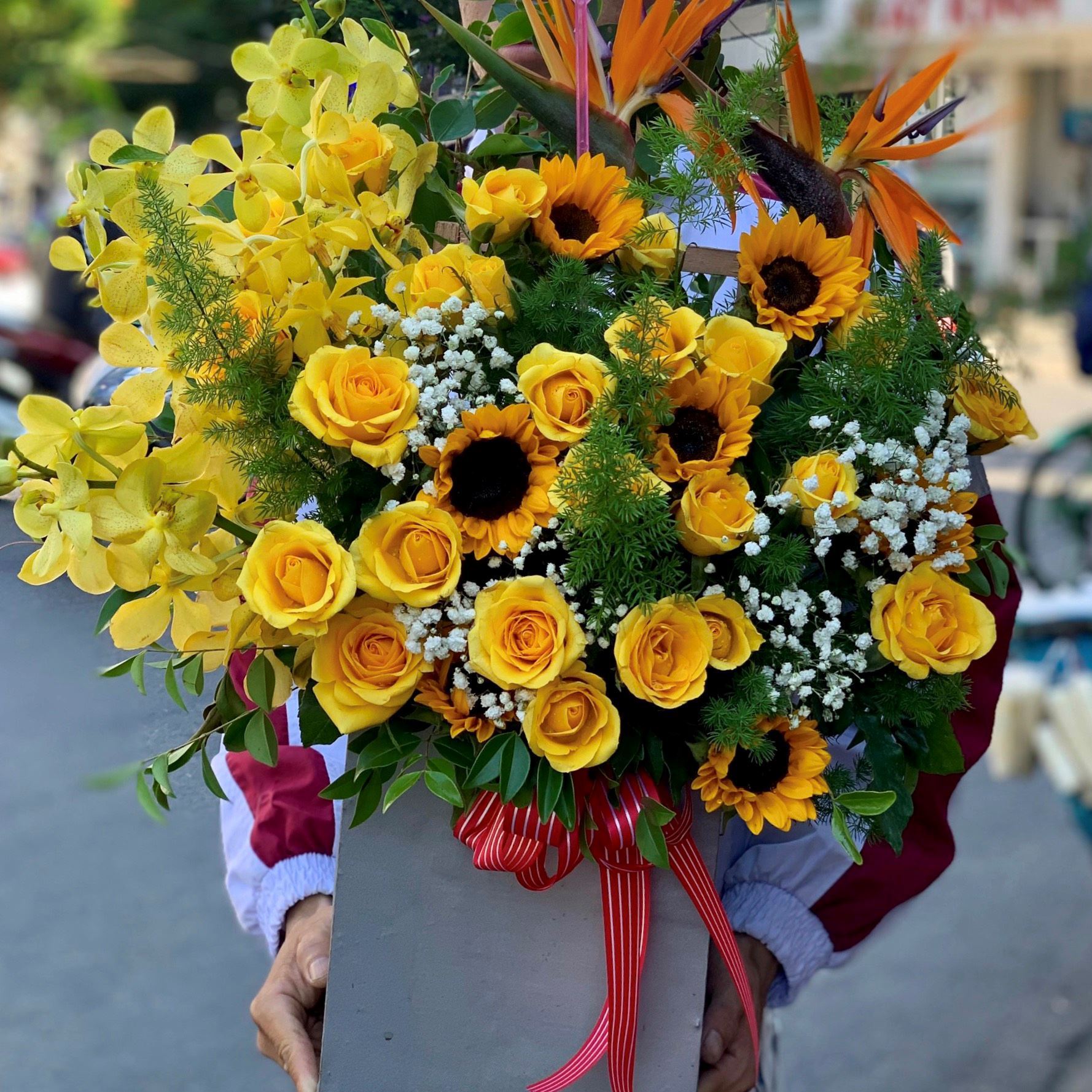 Hoa giỏ lan vàng ,hướng dương,hồng vàng-HG34