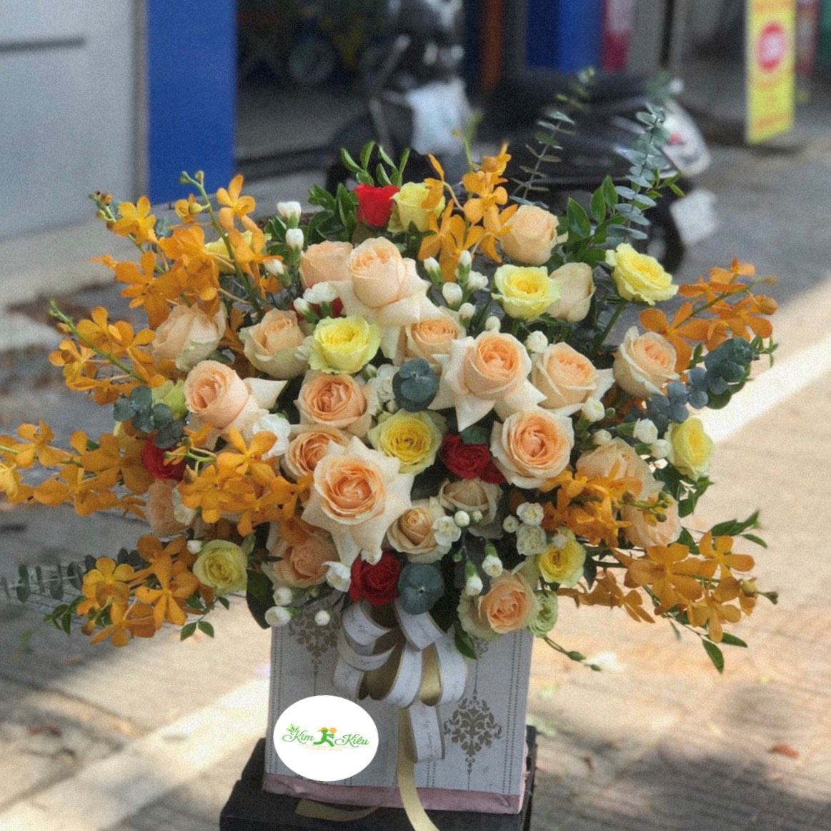 - Mẫu HG02: Lẵng hoa với sự kết hợp giữa tông màu mỡ gà tinh tế và tông vàng đầy tươi sáng từ những cánh hoa mỡ gà và lan. Trong những dịp khai trương, kỉ niệm, chúc mừng hãy gửi đến bạn bè, đối tác, đồng nghiệp lời chúc may mắn đầy hân hoan và chân thành nhất thông qua lẵng hoa đầy sắc màu này nhé. - Mẫu HG02 gồm các loại hoa: + hoa hồng mỡ gà + hoa hồng vàng + hoa hồng đỏ + lan vàng nghệ + và các hoa,lá phụ khác - Liên hệ KIM KIỀU FLOWER để tư vấn thiết kế mẫu hoa theo yêu cầu bạn nhé!