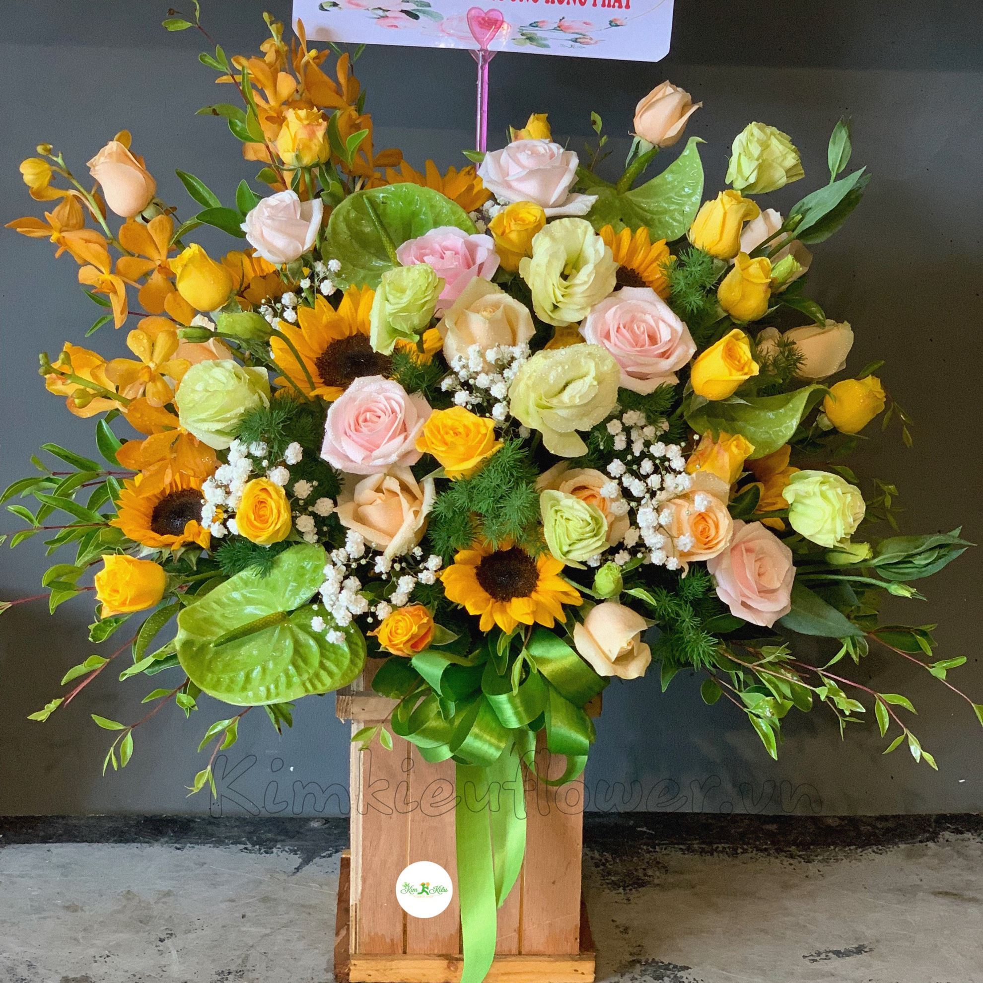 Mẫu HG135 gồm các loại hoa: + hoa hướng dương + hoa hồng vàng + hoa hồng kem + hoa hồng mỡ gà + hoa cát tường xanh + huyết môn xanh + lan mokara + và các hoa,lá phụ khác - Liên hệ KIM KIỀU FLOWER để tư vấn thiết kế mẫu hoa theo yêu cầu bạn nhé!
