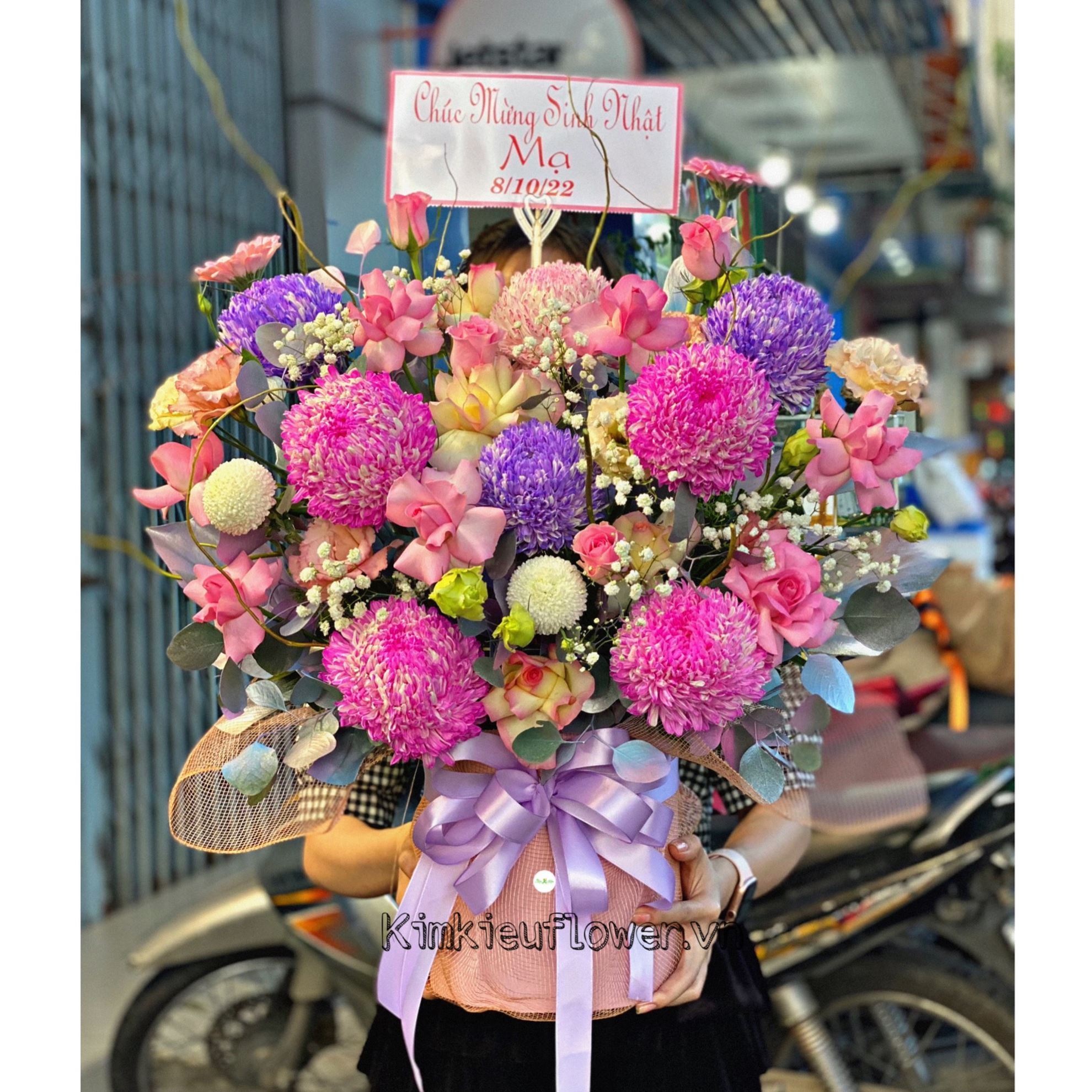 Mẫu HP64 gồm các loại hoa: + 5 cúc mẫu đơn hồng + 3 cúc mẫu đơn tím + hoa hồng dâu + cát tường + và các lá phụ khác - Liên hệ KIM KIỀU FLOWER để tư vấn thiết kế mẫu hoa theo yêu cầu bạn nhé!