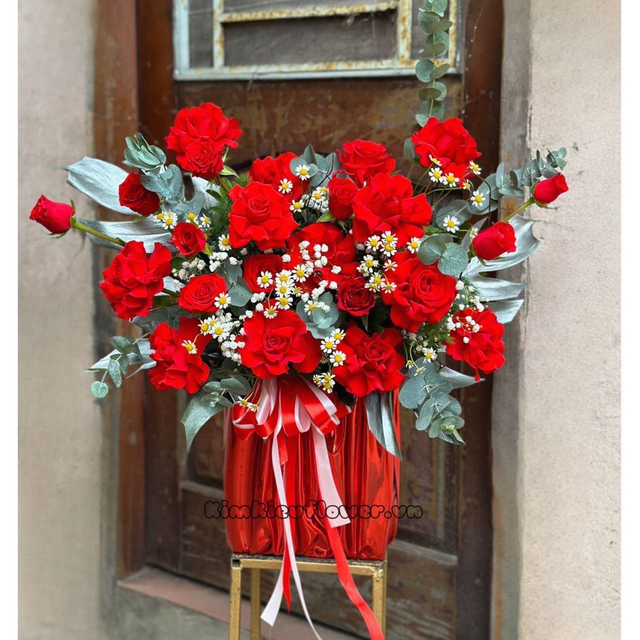 Mẫu HT535 gồm các loại hoa: + 23 hoa hồng đỏ ( 13 lận, 10 không lận) + và các lá phụ khác - Liên hệ KIM KIỀU FLOWER để tư vấn thiết kế mẫu hoa theo yêu cầu bạn nhé!