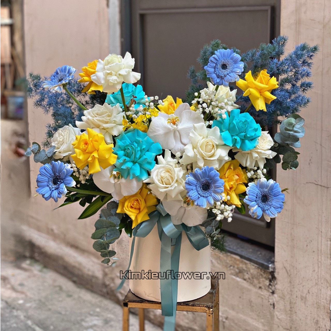 Mẫu HG530 gồm các loại hoa: + hoa hồng xanh + hoa hồng trắng + hoa hồng vàng + đồng tiền nhí + lan hồ điệp trắng + và các lá phụ khác - Liên hệ KIM KIỀU FLOWER để tư vấn thiết kế mẫu hoa theo yêu cầu bạn nhé!