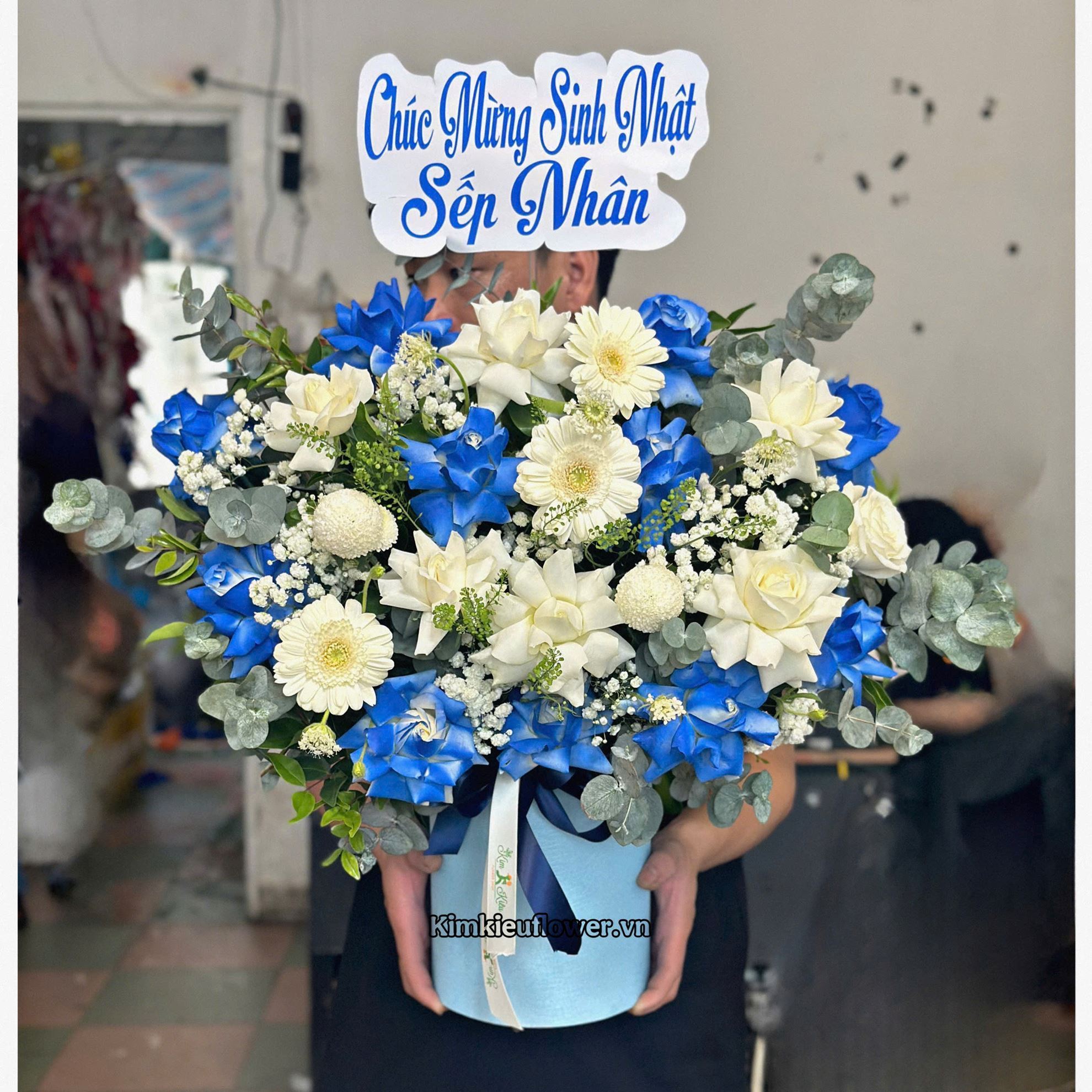 Mẫu HG881 gồm các loại hoa: + hoa hồng trắng xịt xanh dương + hoa hồng trắng + đồng tiền nhí + pingpong trắng + và các lá phụ khác - Liên hệ KIM KIỀU FLOWER để tư vấn thiết kế mẫu hoa theo yêu cầu bạn nhé!