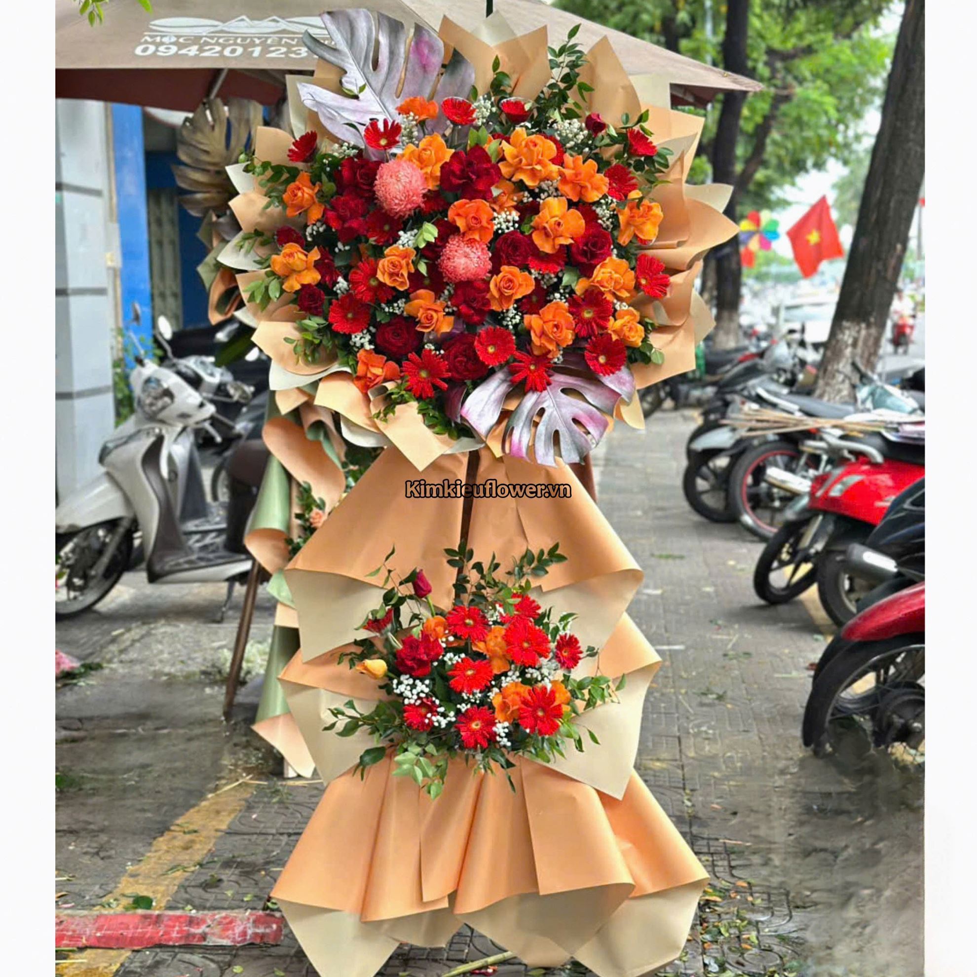 Kệ chúc mừng tone đỏ cam, cúc mẫu đơn - KH432