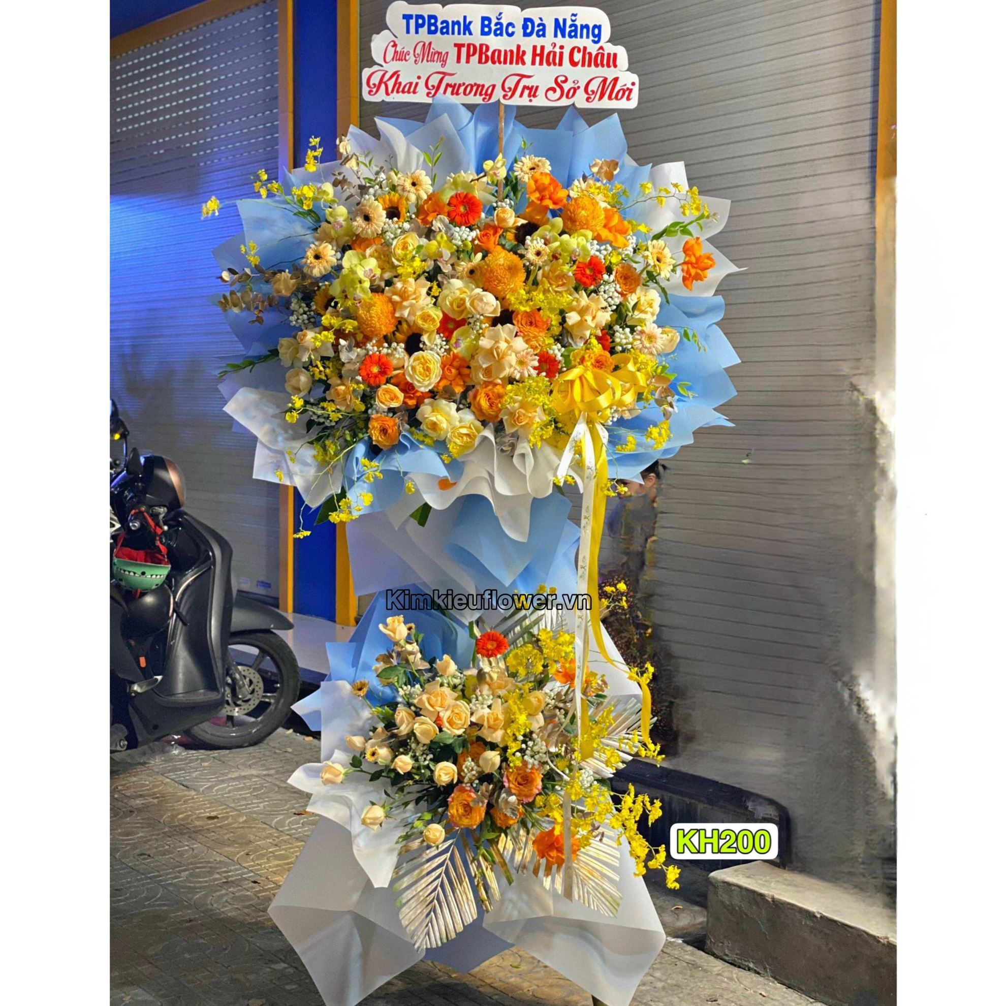 Kệ hoa chúc mừng cúc mẫu đơn, lan hồ điệp vàng - KH205
