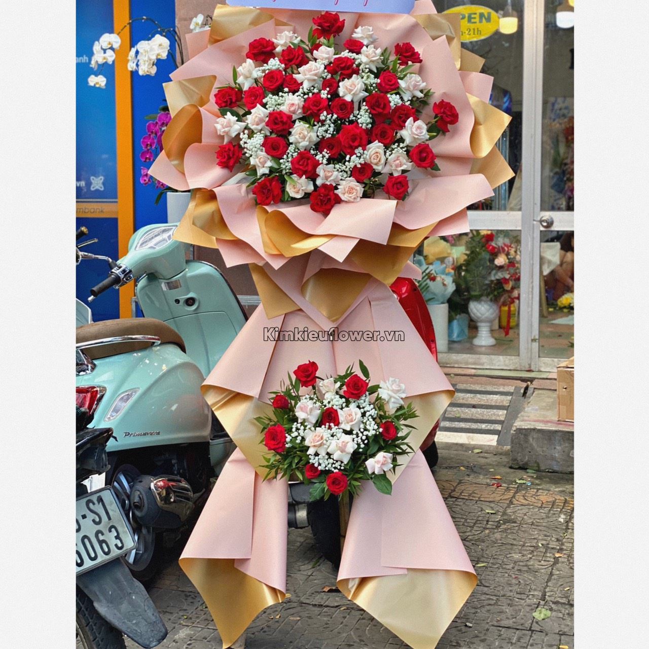 Mẫu KH182 gồm các loại hoa: + 38 hoa hồng đỏ + 26 hoa hồng kem + và các hoa, lá phụ khác- Liên hệ KIM KIỀU FLOWER để tư vấn thiết kế mẫu hoa theo yêu cầu bạn nhé!