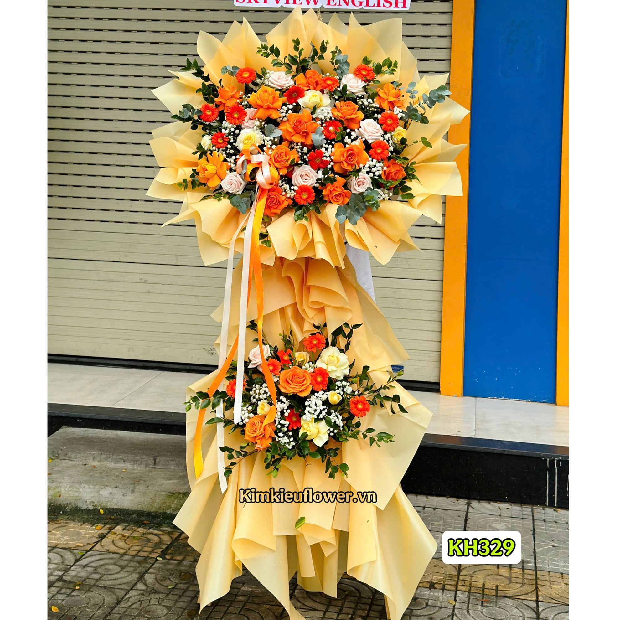 Mẫu KH329 gồm các loại hoa: + 14 Hồng cam quốc vương + 8 Hồng victo vàng + 8 Hồng kem + 21 Đồng tiền nhí cam + và các lá phụ khác - Liên hệ KIM KIỀU FLOWER để tư vấn thiết kế mẫu hoa theo yêu cầu bạn nhé!